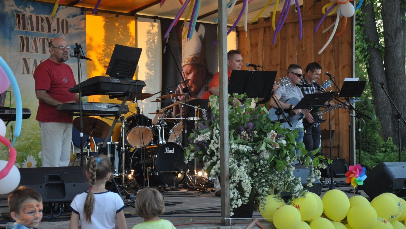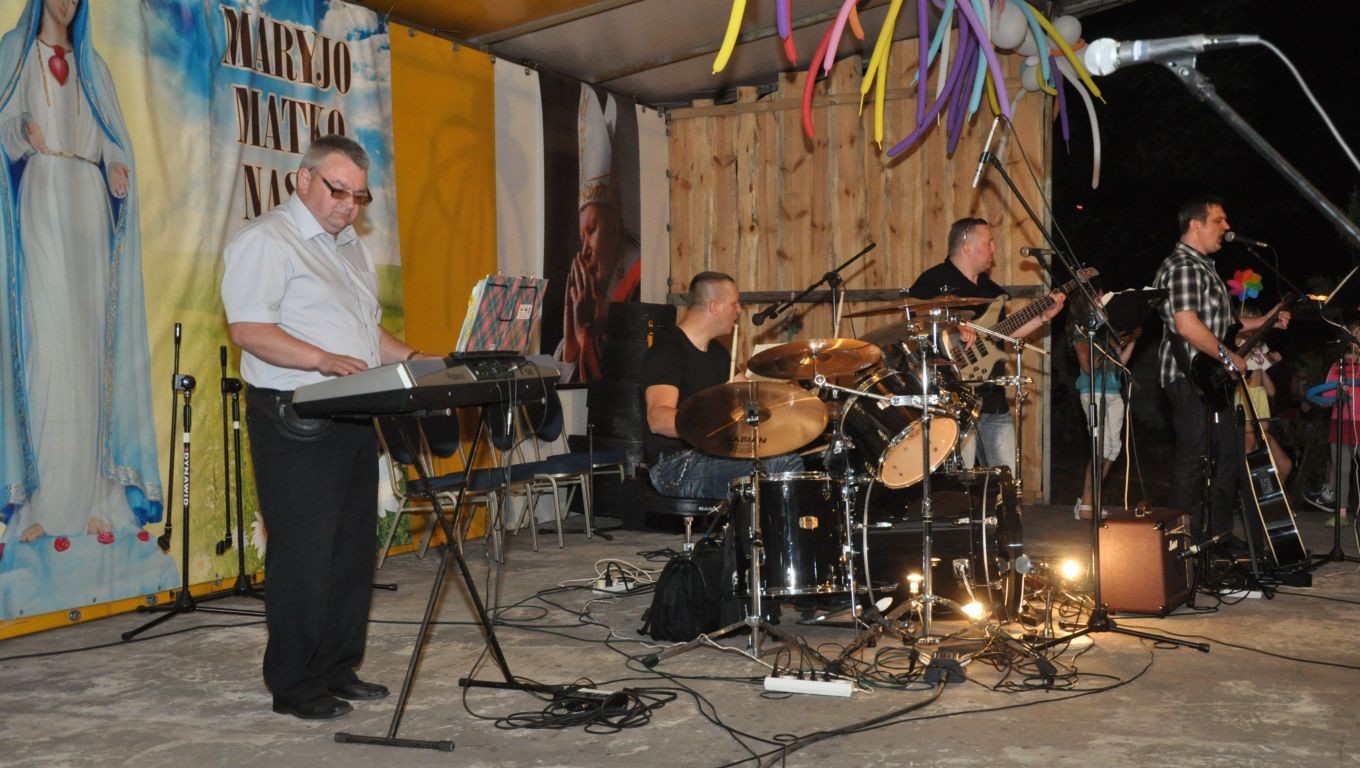 Następnie zgromadzeni uczestniczyli w odprawionym na świeżym powietrzu Nabożeństwie Majowym a po nim została odprawiona wieczorna Msza Święta. Uczestnicy zabawy, którzy byli już wcześniej na Mszy Świętej mogli obserwować mecz pomiędzy drużynami UKS Niezapominajki a Ministrantami z naszej parafii. Kolejną atrakcją był występ Kwartetu NSJ. O godzinie 2000 wyłoniono 6 szczęśliwych uczestników festynu, a wśród nich najszczęśliwszego, który otrzymał skuter. Po losowaniu wystąpił zespół Kan Tax, zaś po godzinie 2100 można było podziwiać pokaz sztucznych ogni. Na końcu przy muzyce dyskotekowej zebrani bawili się przez godzinę, po czym ksiądz proboszcz dziękując wszystkim za przybycie zakończył festyn.