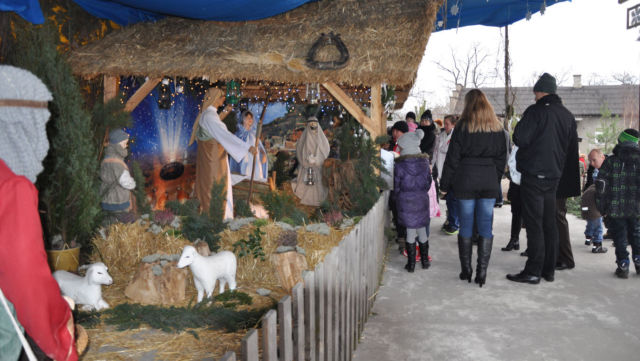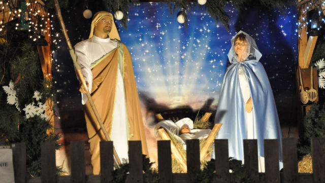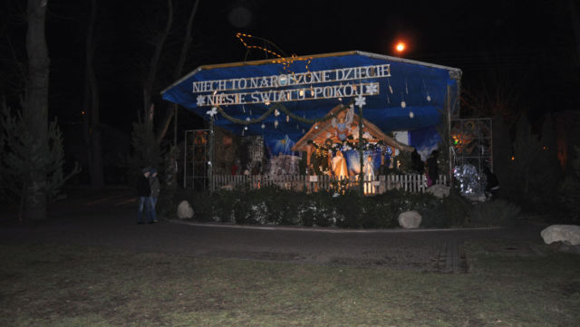 Zdjęcia szopki wieczorem.