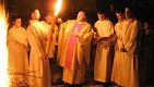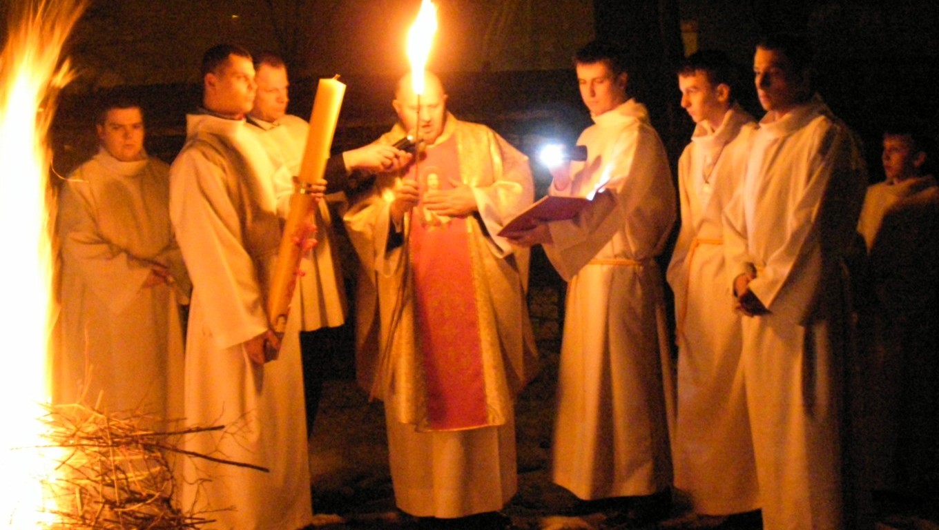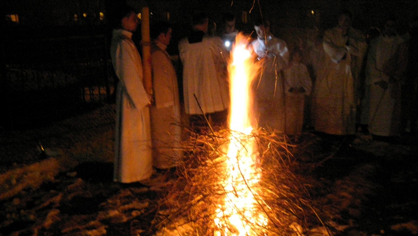 Przed kościołem rozpalane jest ognisko i następuje poświęcenie ognia. Ogień jest symbolem słupu ognia, przez który Bóg objawił się Mojżeszowi. Od ognia zapalana jest świeca paschalna, którą wnosi się w czasie procesji do kościoła. Od paschału zapalane są świece przyniesione przez wiernych symbolizujące zmartwychwstanie.