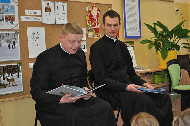 Nasi kapłani po raz kolejny aktywnie włączyli się w ogólnopolską kampanię społeczną Fundacji ABC XXI Cała Polska Czyta Dzieciom! Tym razem 11.12 b.r. do zaprzyjaźnionego Przedszkola Samorządowego w Ujeździe na głośne czytanie przybył ks. wikariusz Piotr Kępniak, który natychmiast zdobył dziecięcą sympatię. Nasz duchowny wraz z miejscowym ks. wikariuszem - Rolandem Białasem w piękny, mądry sposób przybliżyli milusińskim postać św. Mikołaja, zwyczaje bożonarodzeniowe, a także zachęcali do wszelkich działań wolontarystycznych na miarę kilkulatków! Urocze przedpołudnie zakończyło wzajemne złożenie sobie serdecznych, płynących z głębi serca, świątecznych życzeń. Postawa godna naśladowania! Przypomnijmy, iż Episkopat Polski nagrodził Fundację ABC XXI za wzorowe promowanie pięknej, poprawnej polszczyzny, a także przybliżanie najważniejszych wartości współczesnego świata.