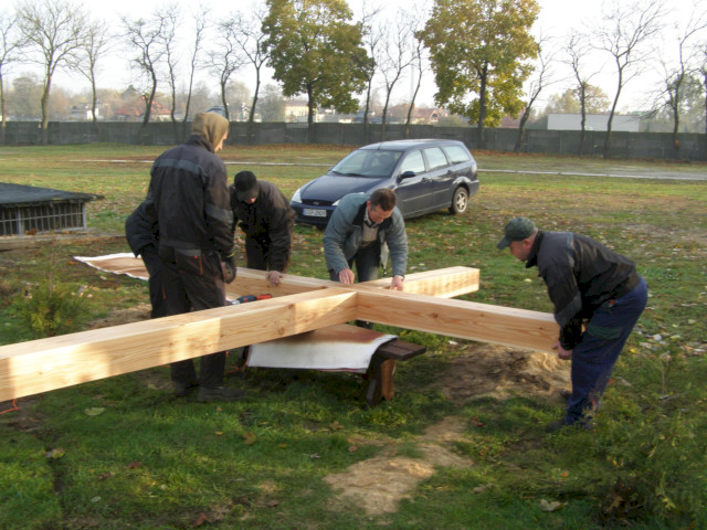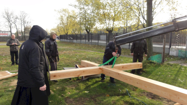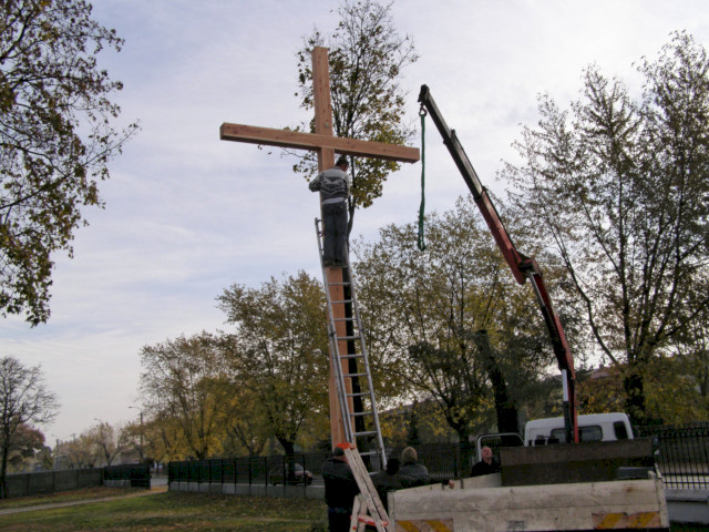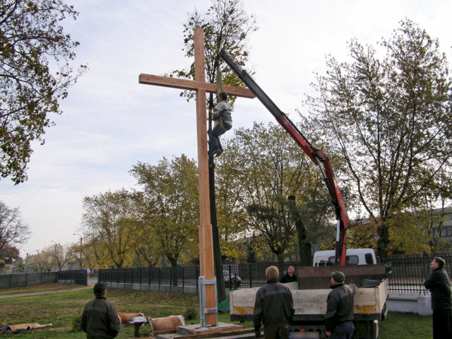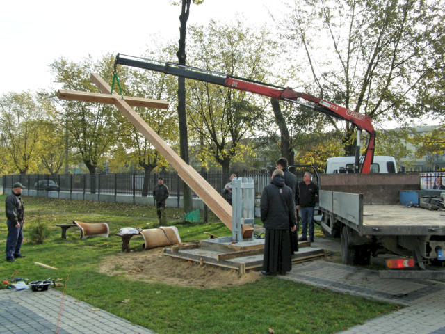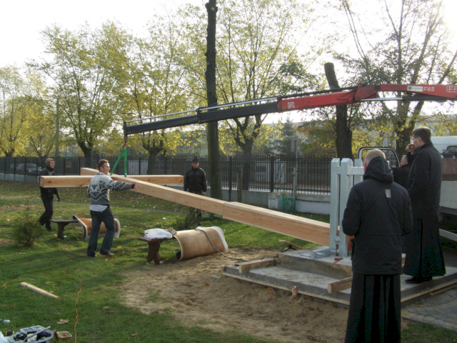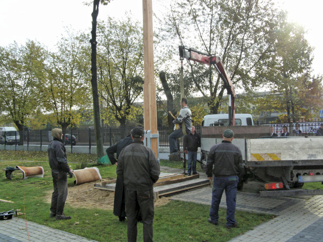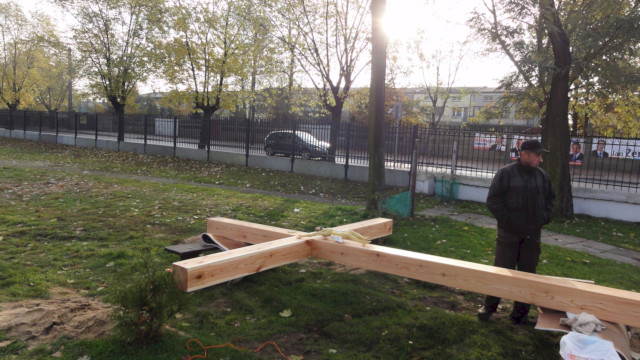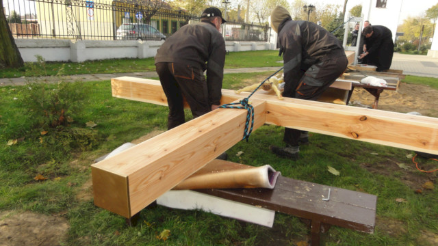 Zdjęcia poniżej przedstawiają poszczególne etapy: obróbki drewna, przygotowań fundamentu i stalowego uchwytu oraz postawienia drzewa krzyża.