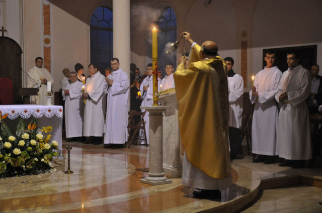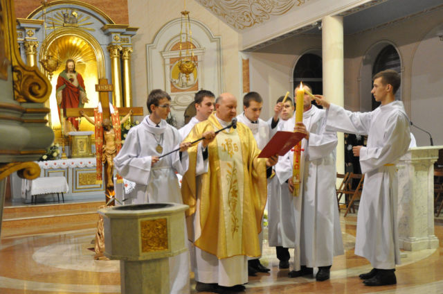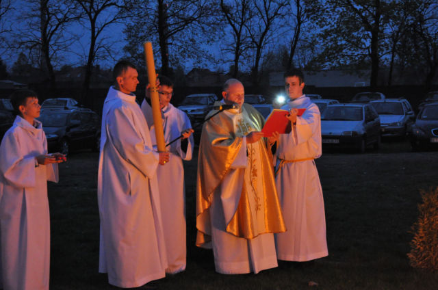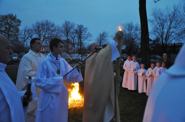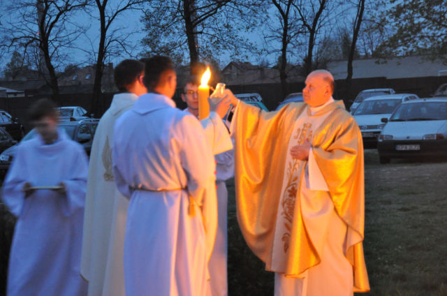W kościołach odprawiana jest wtedy Liturgia Światła. Przed świątynią następuje poświęcenie ognia. Ogień jest symbolem słupu ognia, przez który Bóg objawił się Mojżeszowi. Od ognia zapalana jest świeca paschalna, którą wnosi się w czasie procesji do kościoła. Od paschału zapalane są świece przyniesione przez wiernych symbolizujące zmartwychwstanie.