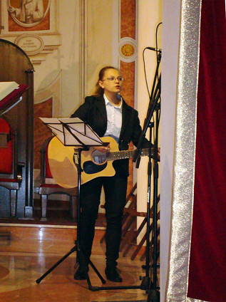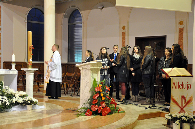 Schola młodzieżowa wzbogaciła swoim śpiewem modlitwy zanoszone za wstawiennictwem Jana Pawła do Boga. Śpiewana koronka do Bożego Miłosierdzia, prowadzona przez naszego księdza wikariusza wraz ze scholą to kolejny element czuwania. Ksiądz przeszedł po świątynii z Najświętszym Sakramentem, aby każdy z obecnych w kościele ludzi mógł być bliżej Naszego Pana.