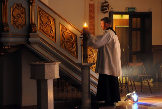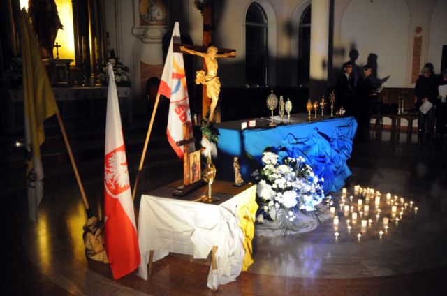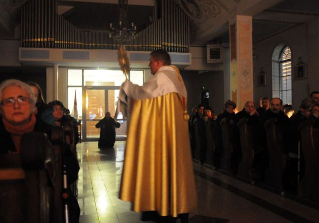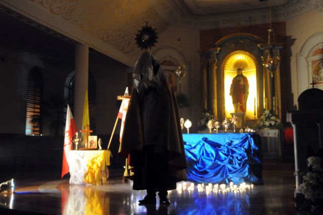 Okolicznościowe kazanie ks. Piotra Stępnia, litania do Wszystkich Świętych oraz przejście główną nawą naszego wikariusza z Monstrancją to kolejne elementy programu tej szczególnej nocy. Tą część uroczystości zakończyło błogosławieństwo Najświętszym Sakramentem.