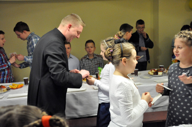 Ksiądz Piotr chętnie rozdzielał słodkie nagrody.