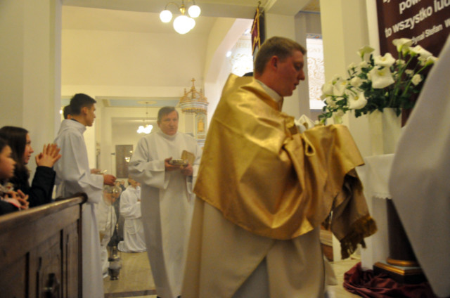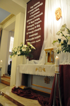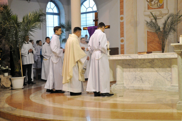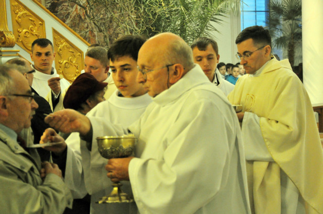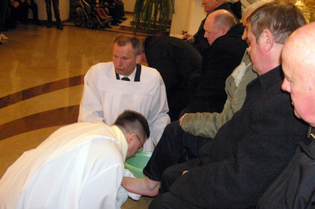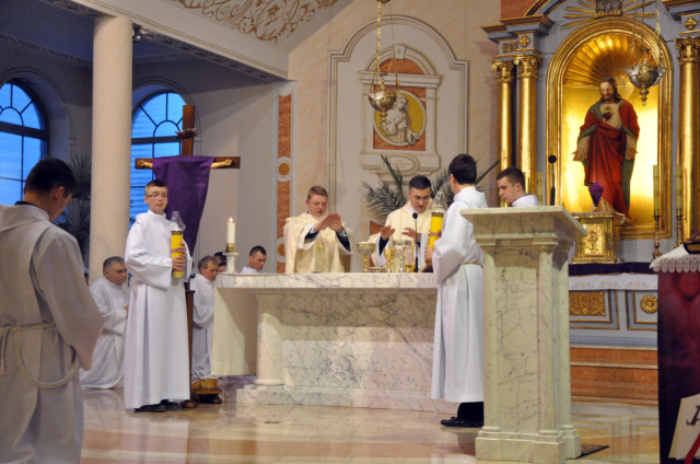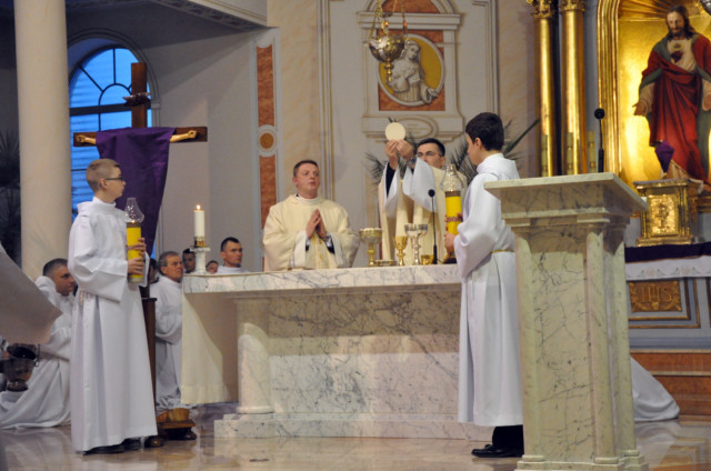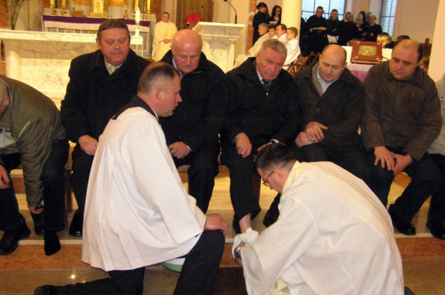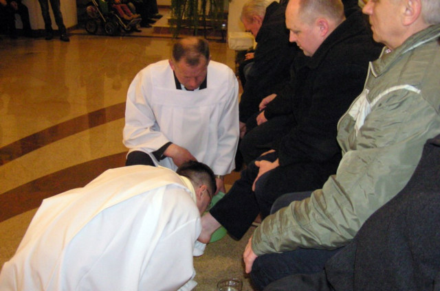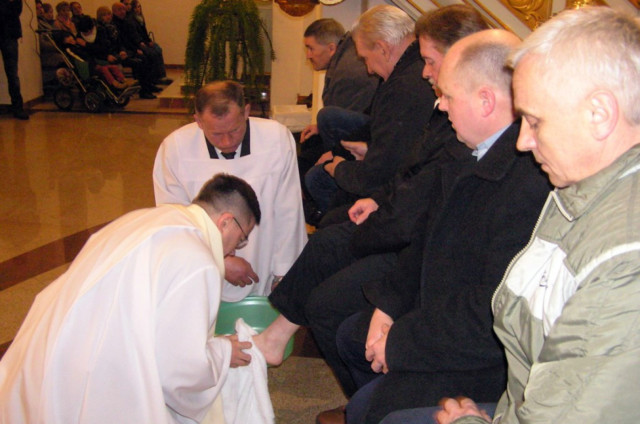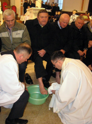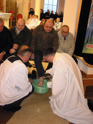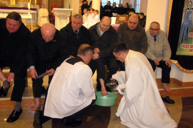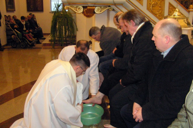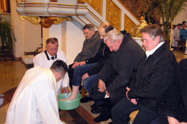 W Wielki Czwartek sprawuje tylko jedną Eucharystię - wieczorem, tzw. Mszę Wieczerzy Pańskiej. W naszej parafii ta Msza św. odprawiana jest o godz. 1800. Jedynie w kościołach katedralnych przez południem odprawiana jest Msza Krzyżma świętego, na której gromadzą się kapłani danej diecezji, by pod przewodnictwem swojego biskupa odnowić święcenia kapłańskie i poświęcić święte oleje, używane podczas sakramentów w ciągu całego roku. Wraz z Modlitwą popołudniową kończy się okres Wielkiego Postu. Mszą Wieczerzy Pańskiej, Kościół rozpoczyna Triduum Paschalne. Wspomina ona tę ostatnią wieczerzę, w czasie której Pan Jezus tej nocy, której był wydany, umiłowawszy aż do końca swoich, którzy byli na świecie, ofiarował Bogu Ojcu swoje Ciało i Krew pod postaciami chleba i wina, i dał Apostołom, aby spożywali, polecił również im oraz ich następcom w kapłaństwie składać ofiarę. Cała uwaga duszy powinna się zwrócić na misteria, które wspomina się w czasie tej mszy: mianowicie ustanowienie Eucharystii i kapłaństwa oraz polecenie Pana o miłości bratniej. Najważniejszym znakiem Wielkiego Czwartku jest stół. Po prostu - stół. Nakrywa się go białym obrusem, kiedy sprawuje się na nim Wieczerzę Pańską i zdejmuje się go zaraz po tym wydarzeniu, bowiem w Wielki Piątek Eucharystia nie będzie celebrowana. Stół tego dnia ma być bardzo wyraźnym znakiem. Jak rodzina w domu staje się nią bardziej, gdy wszyscy jej członkowie zasiadają do stołu, tak i parafia jest rodziną przez to, że ma swój stół. Przed mszą wieczorną tabernakulum powinno być zupełnie puste. W czasie śpiewania hymnu Chwała na wysokości biją dzwony, które po skończeniu hymnu milkną aż do hymnu Chwała na wysokości Wigilii Paschalnej. Umywanie nóg wybranym mężczyznom, które zgodnie z tradycją odbywa się w tym dniu, oznacza postawę służebną i miłość Chrystusa, który nie przyszedł aby mu służono, lecz aby służyć. W tym dniu ustanowienia sakramentu kapłaństwa dziękujemy też naszym kapłanom za ich posługę.
