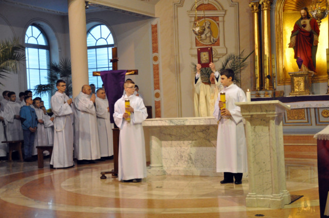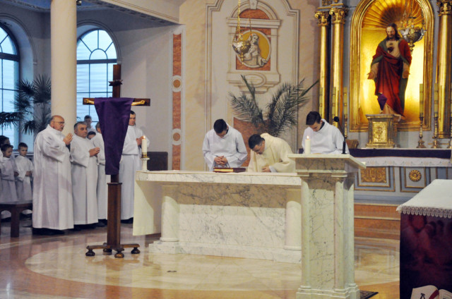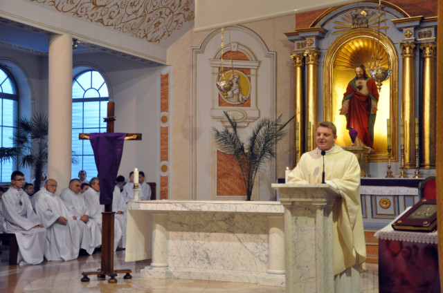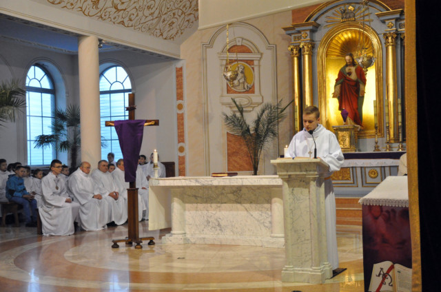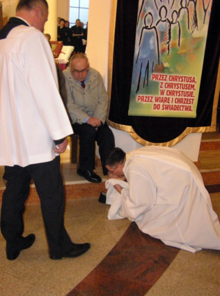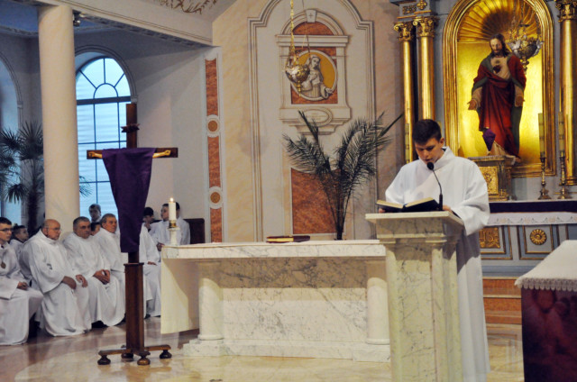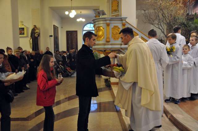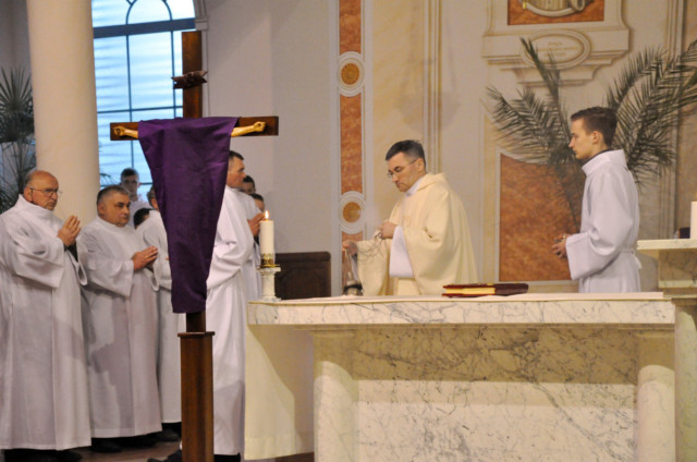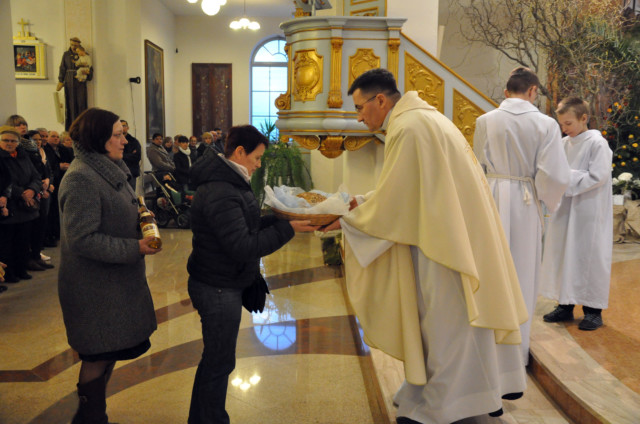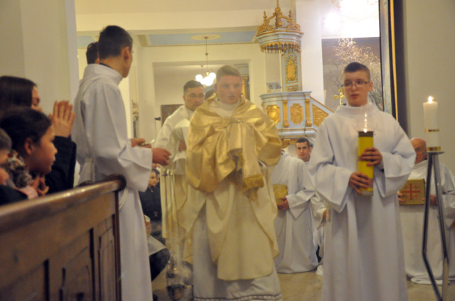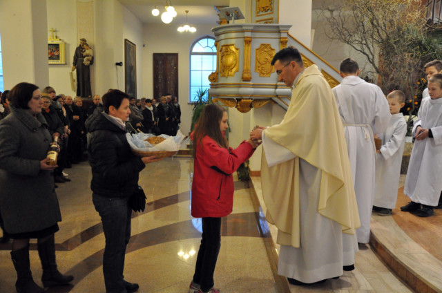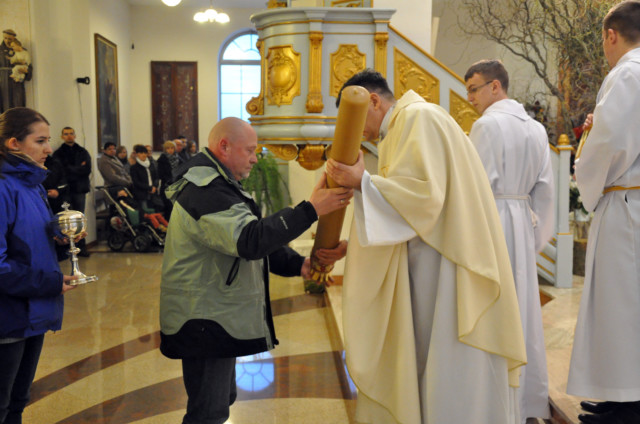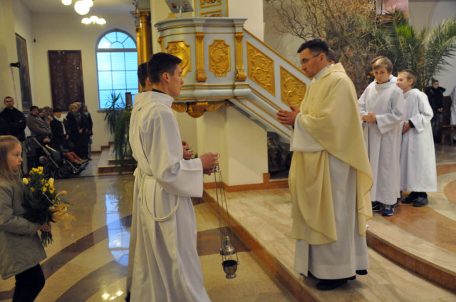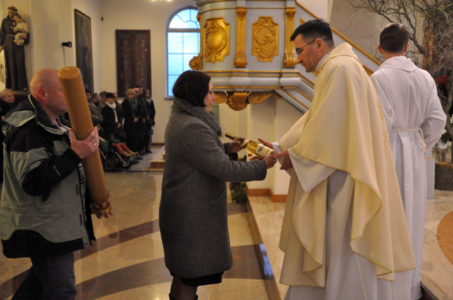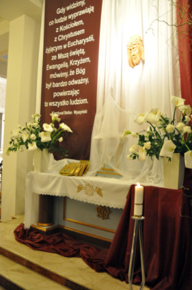 W Wielki Czwartek sprawuje tylko jedną Eucharystię - wieczorem, tzw. Mszę Wieczerzy Pańskiej. W naszej parafii ta Msza św. odprawiana jest o godz. 1800. Jedynie w kościołach katedralnych przez południem odprawiana jest Msza Krzyżma świętego, na której gromadzą się kapłani danej diecezji, by pod przewodnictwem swojego biskupa odnowić święcenia kapłańskie i poświęcić święte oleje, używane podczas sakramentów w ciągu całego roku. Wraz z Modlitwą popołudniową kończy się okres Wielkiego Postu. Mszą Wieczerzy Pańskiej, Kościół rozpoczyna Triduum Paschalne. Wspomina ona tę ostatnią wieczerzę, w czasie której Pan Jezus tej nocy, której był wydany, umiłowawszy aż do końca swoich, którzy byli na świecie, ofiarował Bogu Ojcu swoje Ciało i Krew pod postaciami chleba i wina, i dał Apostołom, aby spożywali, polecił również im oraz ich następcom w kapłaństwie składać ofiarę. Cała uwaga duszy powinna się zwrócić na misteria, które wspomina się w czasie tej mszy: mianowicie ustanowienie Eucharystii i kapłaństwa oraz polecenie Pana o miłości bratniej. Najważniejszym znakiem Wielkiego Czwartku jest stół. Po prostu - stół. Nakrywa się go białym obrusem, kiedy sprawuje się na nim Wieczerzę Pańską i zdejmuje się go zaraz po tym wydarzeniu, bowiem w Wielki Piątek Eucharystia nie będzie celebrowana. Stół tego dnia ma być bardzo wyraźnym znakiem. Jak rodzina w domu staje się nią bardziej, gdy wszyscy jej członkowie zasiadają do stołu, tak i parafia jest rodziną przez to, że ma swój stół. Przed mszą wieczorną tabernakulum powinno być zupełnie puste. W czasie śpiewania hymnu Chwała na wysokości biją dzwony, które po skończeniu hymnu milkną aż do hymnu Chwała na wysokości Wigilii Paschalnej. Umywanie nóg wybranym mężczyznom, które zgodnie z tradycją odbywa się w tym dniu, oznacza postawę służebną i miłość Chrystusa, który nie przyszedł aby mu służono, lecz aby służyć. W tym dniu ustanowienia sakramentu kapłaństwa dziękujemy też naszym kapłanom za ich posługę.