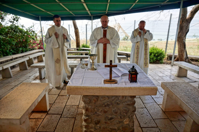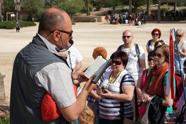 Msza Święta na Górze Tabor (Przemienienie Pańskie) - po prawej stronie o. Tomasz Kowalski, franciszkanin, przewodnik naszych pielgrzymów