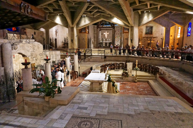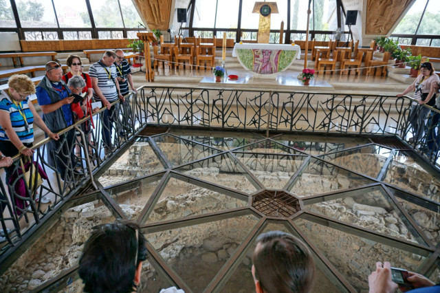 Kafarnaum - dom św. Piotra, pod szybą widoczne fundamenty