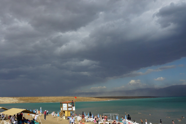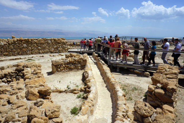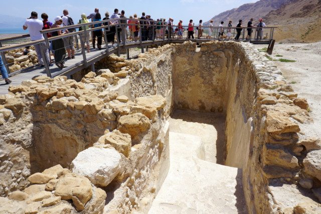 Qumram - miejsce zamieszkania wspólnoty tłumaczącej pisma Starego Testamentu, na horyzoncie Morze Martwe