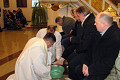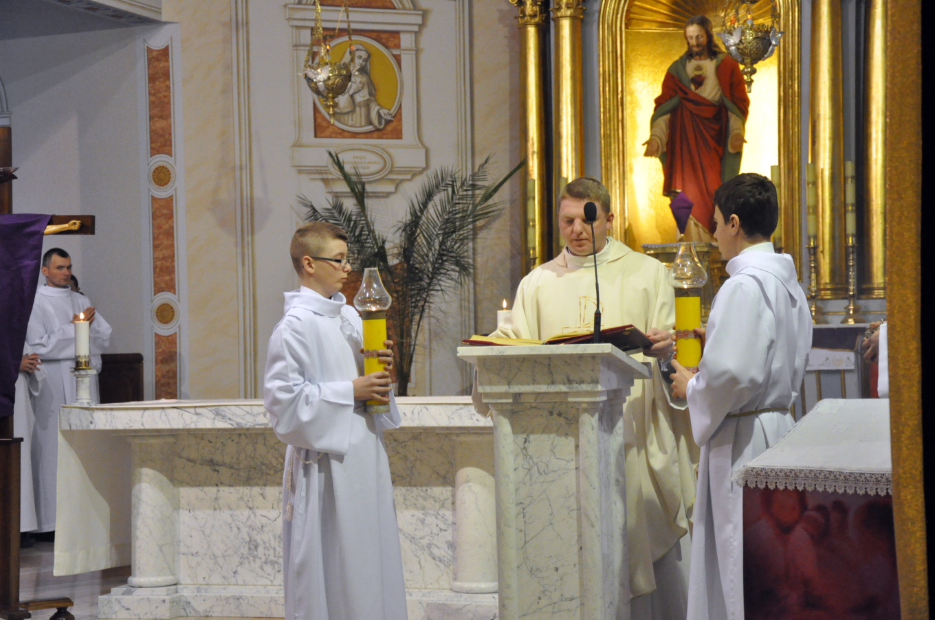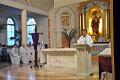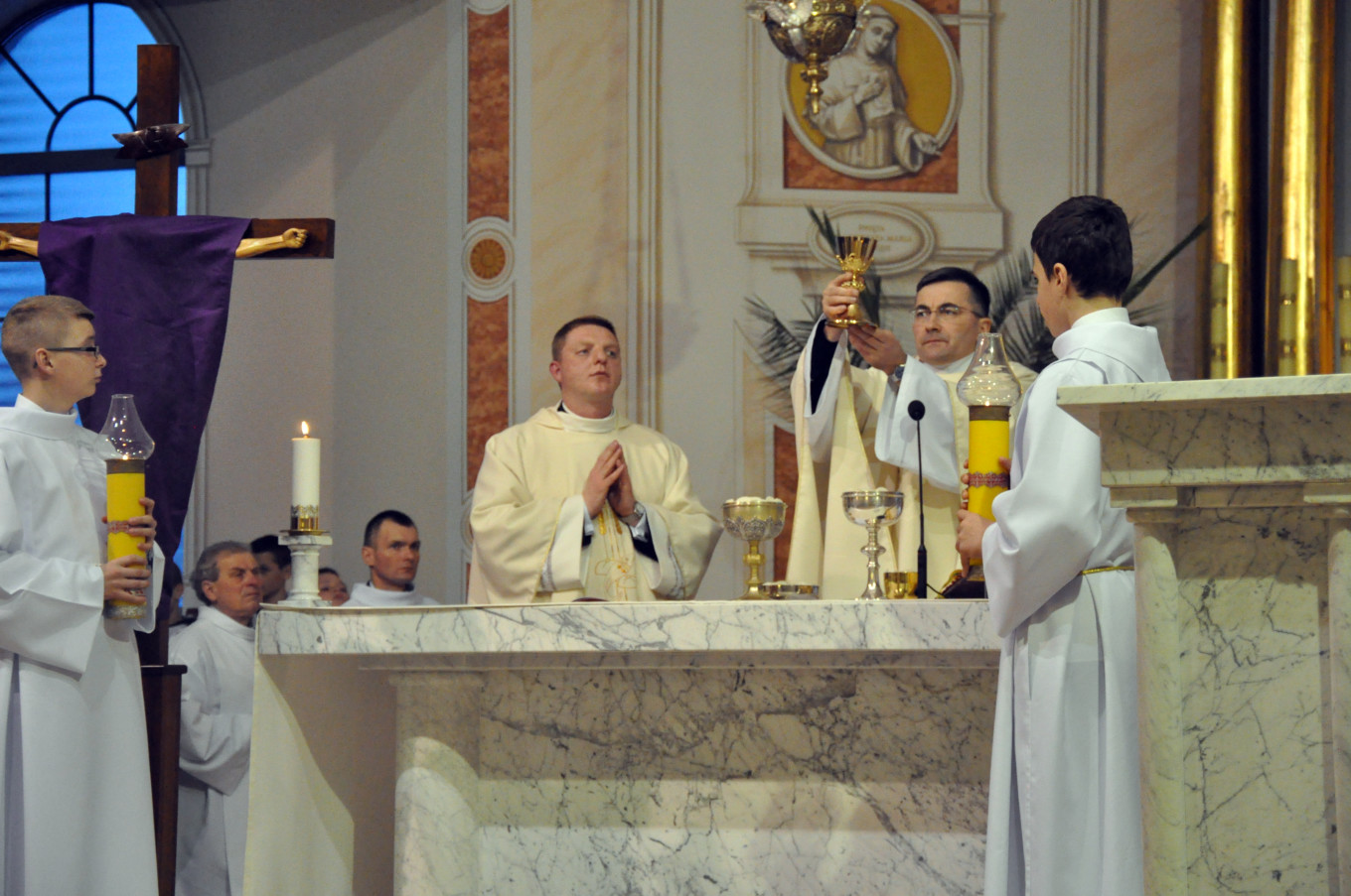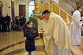 W Wielki Czwartek sprawuje tylko jedną Eucharystię - wieczorem, tzw. Mszę Wieczerzy Pańskiej. W naszej parafii ta Msza św. odprawiana jest o godz. 1800. Jedynie w kościołach katedralnych przez południem odprawiana jest Msza Krzyżma świętego, na której gromadzą się kapłani danej diecezji, by pod przewodnictwem swojego biskupa odnowić święcenia kapłańskie i poświęcić święte oleje, używane podczas sakramentów w ciągu całego roku. Wraz z Modlitwą popołudniową kończy się okres Wielkiego Postu. Mszą Wieczerzy Pańskiej, Kościół rozpoczyna Triduum Paschalne. Wspomina ona tę ostatnią wieczerzę, w czasie której Pan Jezus tej nocy, której był wydany, umiłowawszy aż do końca swoich, którzy byli na świecie, ofiarował Bogu Ojcu swoje Ciało i Krew pod postaciami chleba i wina, i dał Apostołom, aby spożywali, polecił również im oraz ich następcom w kapłaństwie składać ofiarę. Cała uwaga duszy powinna się zwrócić na misteria, które wspomina się w czasie tej mszy: mianowicie ustanowienie Eucharystii i kapłaństwa oraz polecenie Pana o miłości bratniej. Najważniejszym znakiem Wielkiego Czwartku jest stół. Po prostu - stół. Nakrywa się go białym obrusem, kiedy sprawuje się na nim Wieczerzę Pańską i zdejmuje się go zaraz po tym wydarzeniu, bowiem w Wielki Piątek Eucharystia nie będzie celebrowana. Stół tego dnia ma być bardzo wyraźnym znakiem. Jak rodzina w domu staje się nią bardziej, gdy wszyscy jej członkowie zasiadają do stołu, tak i parafia jest rodziną przez to, że ma swój stół. Przed mszą wieczorną tabernakulum powinno być zupełnie puste. W czasie śpiewania hymnu Chwała na wysokości biją dzwony, które po skończeniu hymnu milkną aż do hymnu Chwała na wysokości Wigilii Paschalnej. Umywanie nóg wybranym mężczyznom, które zgodnie z tradycją odbywa się w tym dniu, oznacza postawę służebną i miłość Chrystusa, który nie przyszedł aby mu służono, lecz aby służyć. W tym dniu ustanowienia sakramentu kapłaństwa dziękujemy też naszym kapłanom za ich posługę.
