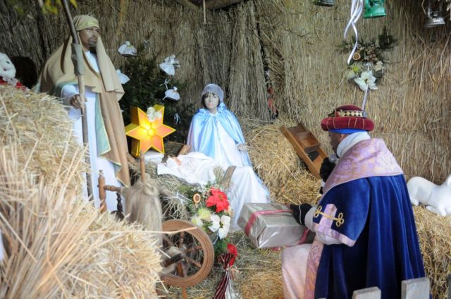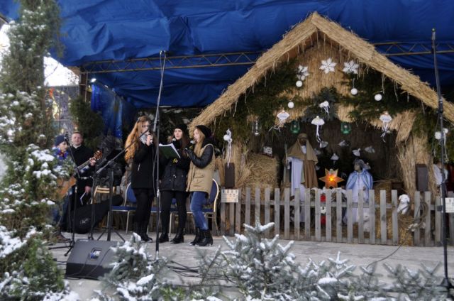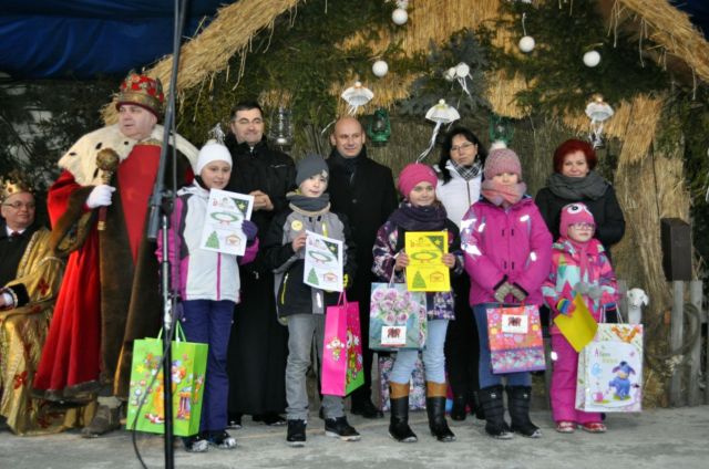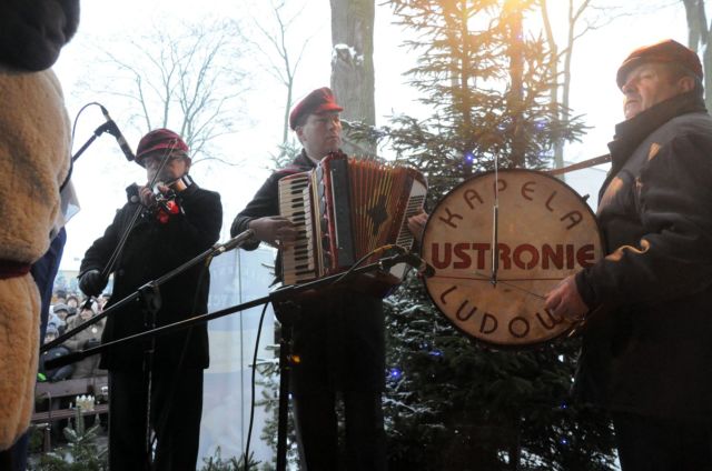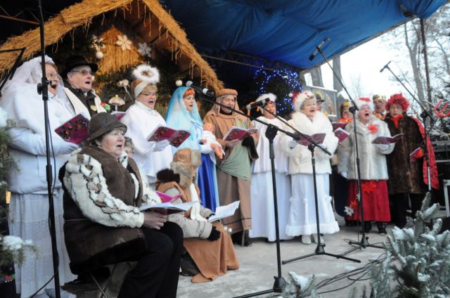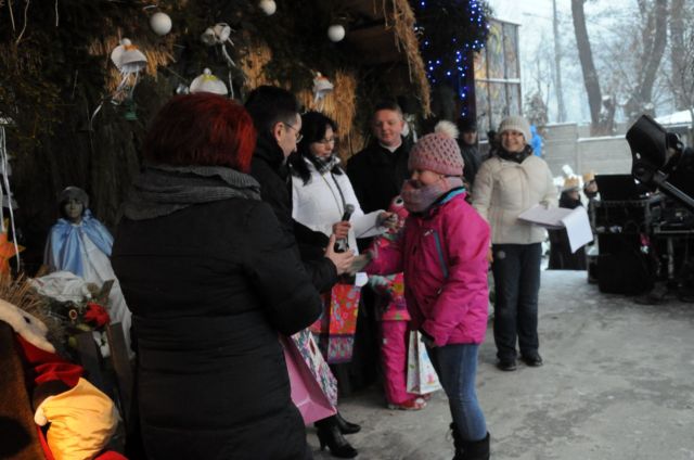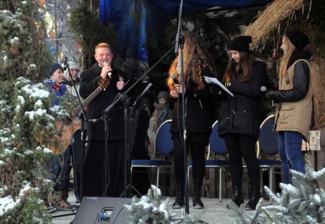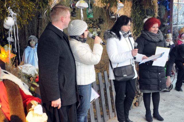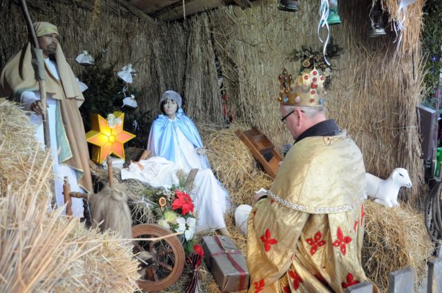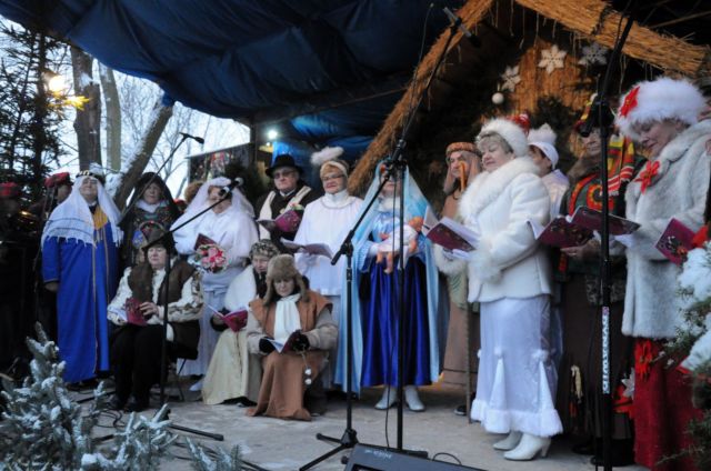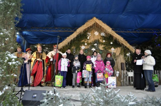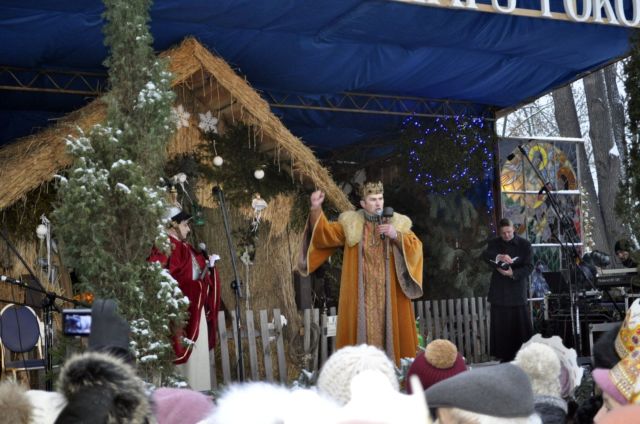 Celem uroczystych orszaków była oczywiście betlejemska stajenka przygotowana na przykościelnym placu naszego kościoła. Część naszych parafian dołączyła do orszaków wędrujących z innych parafii. Pozostali zaś oczekiwali na przybycie gości przed szopką, wypełniając czas śpiewem kolęd pod przewodnictwem młodzieżowej scholi, ks. Piotra i Pana Mirosława - naszego organisty. Przybysze z odległych stron (czytaj parafii) oddali pokłon Boskiemu Dziecięciu i złożyli swe dary. Zgromadzeni parafinie i goście mogli następnie obejrzeć scenkę przedstawiającą wizytę mędrców u króla Heroda. Wierszowane teksty z dziecięcych teatrzyków w ustach dojrzałych mężczyzn brzmiały, co prawda, dość groteskowo. Wpisały jednak się w ogólną ludową konwencję, która, podobnie jak w ubiegłym roku, towarzyszyła uroczystości. Część osób zgromadzonych przed szopką wysłuchało koncertu kolęd w wykonaniu ludowych zespołów "Skrzynkowianki" (oczywiście ze Skrzynek koło Ujazdu) i zespołu "Ustronie" ze Skierniewic. Wielu przybyłych gości udało się natomiast do wnętrza kościoła, by oddać pokłon Wcielonemu Słowu obecnemu wśród nas w Najświętszym Sakramencie, obejrzeć przygotowaną w kościele szopkę i podziwiać ciągle piękniejące wnętrze naszej świątyni.