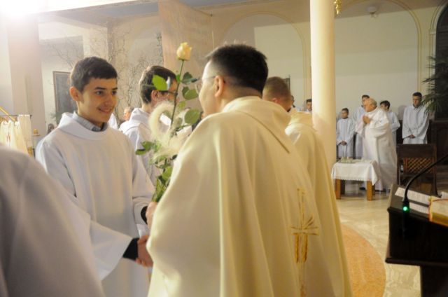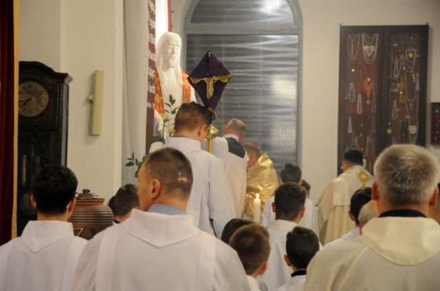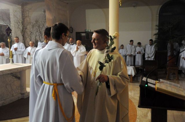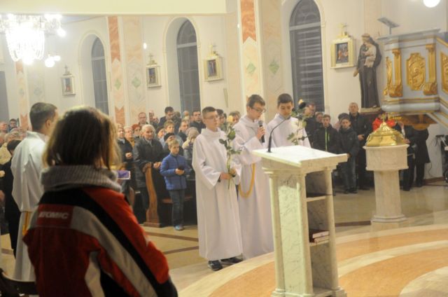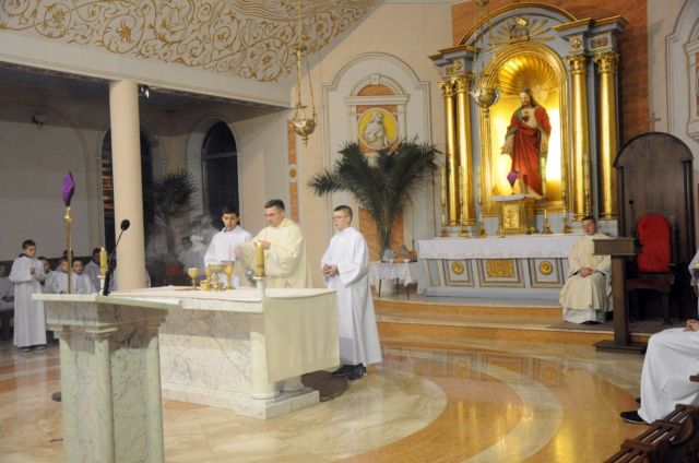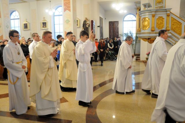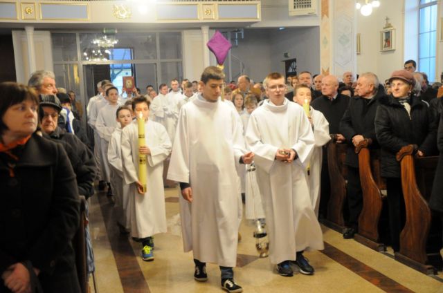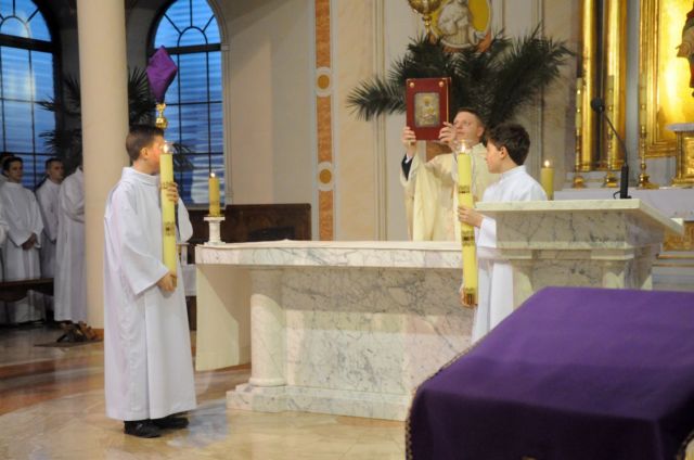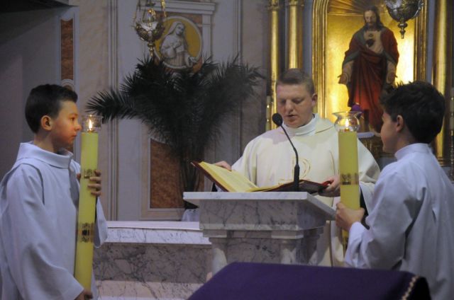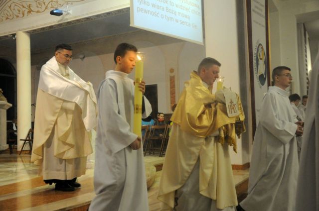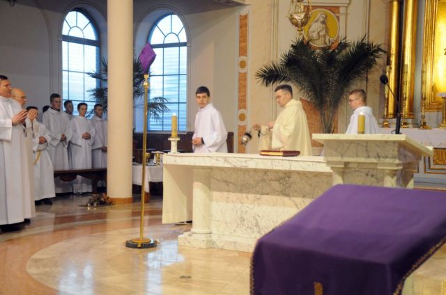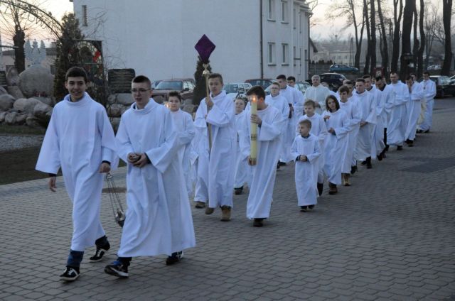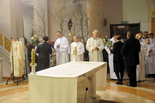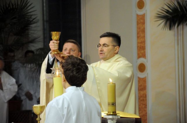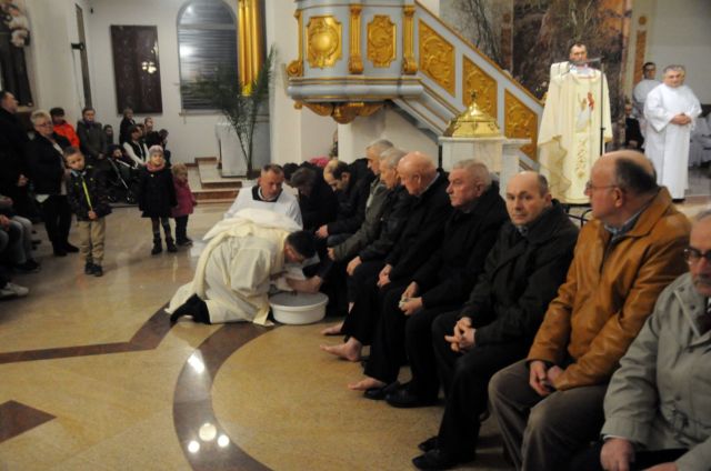 W Wielki Czwartek we wspólnotach parafialnych sprawuje się tylko jedną Eucharystię - wieczorem, tzw. Mszę Wieczerzy Pańskiej. W naszej parafii ta Msza św. odprawiana jest o godz. 1800. Jedynie w kościołach katedralnych przez południem odprawiana jest Msza Krzyżma świętego, na której gromadzą się kapłani danej diecezji, by pod przewodnictwem swojego biskupa odnowić święcenia kapłańskie i poświęcić święte oleje, używane podczas sakramentów w ciągu całego roku. Wraz z Modlitwą popołudniową kończy się okres Wielkiego Postu. Mszą Wieczerzy Pańskiej, Kościół rozpoczyna Triduum Paschalne. Wspomina ona tę ostatnią wieczerzę, w czasie której Pan Jezus tej nocy, której był wydany, umiłowawszy aż do końca swoich, którzy byli na świecie, ofiarował Bogu Ojcu swoje Ciało i Krew pod postaciami chleba i wina, i dał Apostołom, aby spożywali, polecił również im oraz ich następcom w kapłaństwie składać ofiarę. Cała uwaga duszy powinna się zwrócić na misteria, które wspomina się w czasie tej mszy: mianowicie ustanowienie Eucharystii i kapłaństwa oraz polecenie Pana o miłości bratniej. Najważniejszym znakiem Wielkiego Czwartku jest stół. Po prostu - stół. Nakrywa się go białym obrusem, kiedy sprawuje się na nim Wieczerzę Pańską i zdejmuje się go zaraz po tym wydarzeniu, bowiem w Wielki Piątek Eucharystia nie będzie celebrowana. Stół tego dnia ma być bardzo wyraźnym znakiem. Jak rodzina w domu staje się nią bardziej, gdy wszyscy jej członkowie zasiadają do stołu, tak i parafia jest rodziną przez to, że ma swój stół. Przed mszą wieczorną tabernakulum powinno być zupełnie puste. W czasie śpiewania hymnu Chwała na wysokości biją dzwony, które po skończeniu hymnu milkną aż do hymnu Chwała na wysokości Wigilii Paschalnej. Umywanie nóg wybranym mężczyznom, które zgodnie z tradycją odbywa się w tym dniu, oznacza postawę służebną i miłość Chrystusa, który nie przyszedł aby mu służono, lecz aby służyć. W tym dniu ustanowienia sakramentu kapłaństwa dziękujemy też naszym kapłanom za ich posługę.