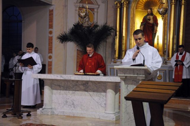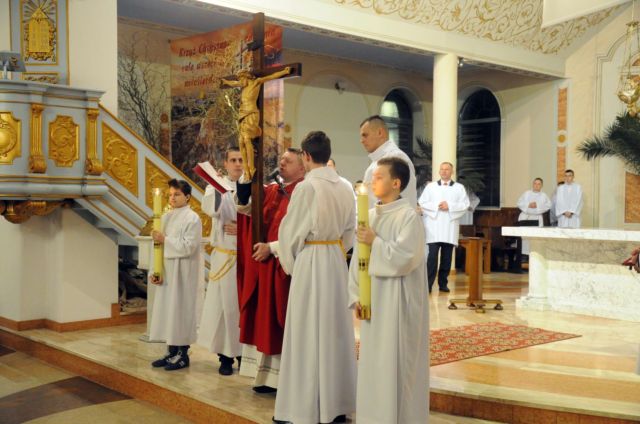 Liturgia Męki Pańskiej rozpoczyna się o godzinie 1800 od upadnięcia na twarz przed faktem śmierci Chrystusa. Wobec tej śmierci nie mamy nic do powiedzenia i silenie się na słowa jest nie na miejscu. Tak zachowuje się dzisiaj Kościół - w milczeniu pada przed faktem męki i śmierci Chrystusa, nie usprawiedliwia się, nie tłumaczy, nie przeprasza, lecz pada. Po chwili uniżenia wszyscy wstają i zaczyna się modlitwa prezbitera oraz liturgia słowa - najpierw czytanie z proroka i szczytowy moment - opis Męki Pańskiej. Również w Wielki Piątek Kościół śpiewa Mękę Pańską W Wielki Piątek zawsze czytamy Ewangelię według św. Jana. Jan nie odtwarza tylko wydarzeń, lecz patrzy na mękę Chrystusa z perspektywy zwycięstwa. Nie ma tam opisu męki, cierpienia, lecz teologiczne spojrzenie - ukazuje zbawczy wymiar męki i śmierci Chrystusa, proklamuje Jego zwycięstwo na krzyżu.