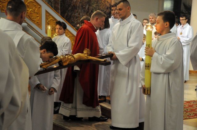 Po rozbudowanej, uroczystej modlitwie powszechnej następuje adoracja krzyża, czyli druga część wielkopiątkowej liturgii. Adorujemy jeden krzyż i traktujemy go jako ten krzyż, na którym Chrystus umarł. Krzyż z Kalwarii pomnaża się i dziś urzeczywistnia się właśnie w tym krzyżu. Z tą samą wiarą, z jaką byśmy podchodzili do krzyża na Kalwarii, podchodzimy do krzyża, który jest intronizowany w liturgii. Przed nim klękamy. Także przez cały dzień w Wielką Sobotę, aż do liturgii Wielkiej Nocy klęka się przed krzyżem jak przed Najświętszym Sakramentem. Odsłanianie krzyża następuje w sposób uroczysty - na śpiew Oto drzewo krzyża na którym zawisło zbawienie świata, wszyscy odpowiadamy: Pójdźmy z pokłonem i klękamy na dwa kolana. Powtarza się to trzy razy. Potem po kolei podchodzimy pod krzyż, i przed nim klękamy lub całujemy Go. Adorowanie krzyża oznacza, że dla nas nie ma nic cenniejszego nad Chrystusa, nad Jego śmierć i zmartwychwstanie.