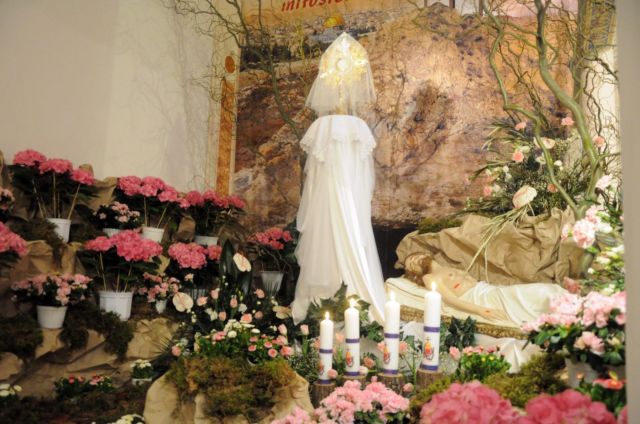 Po adoracji krzyża przygotowuje się ołtarz oraz przynosi się konsekrowany w Wieli Czwartek Chleb Eucharystyczny Zaczyna się przygotowanie do Komunii świętej, czyli modlitwa Pańska oraz przyjęcie komunii. Po przyjęciu Ciała Pańskiego, Najświętszy Sakrament przenosi się do miejsca adoracji i przechowania. W polskiej tradycji jest to ołtarz udekorowany na kształt grobu Chrystusa. Monstrancja okryta jest welonem na znak, że Chrystus skrył przed nami swe Bóstwo, że uniżył samego siebie aż do śmierci krzyżowej. Jednak to Monstrancja a nie figura Chrystusa jest centralnym punktem, ku któremu winien biegnąć pełen uwielbienia wzrok. Adoracja trwa do rozpoczęcia Wigilii Paschalnej.