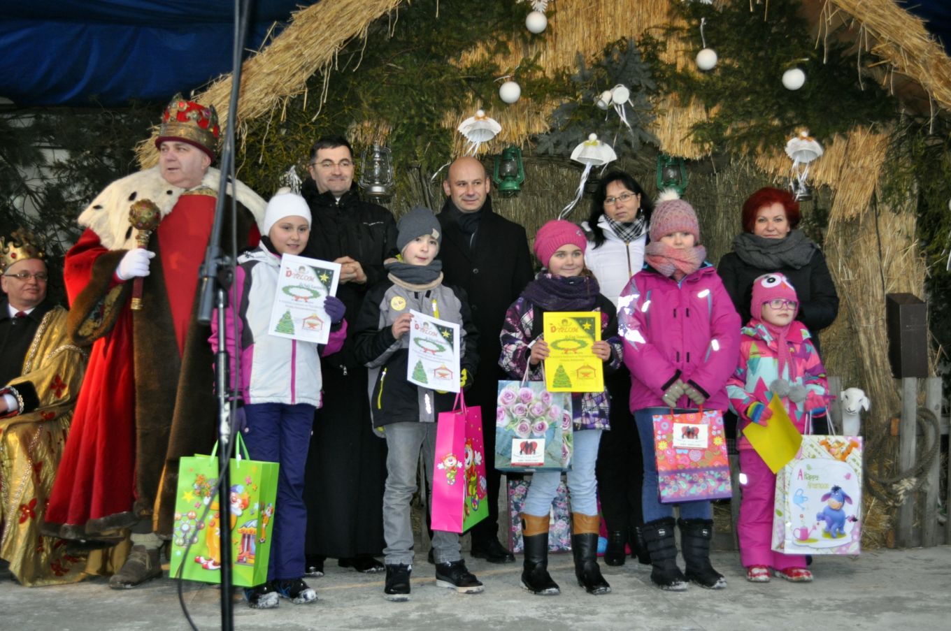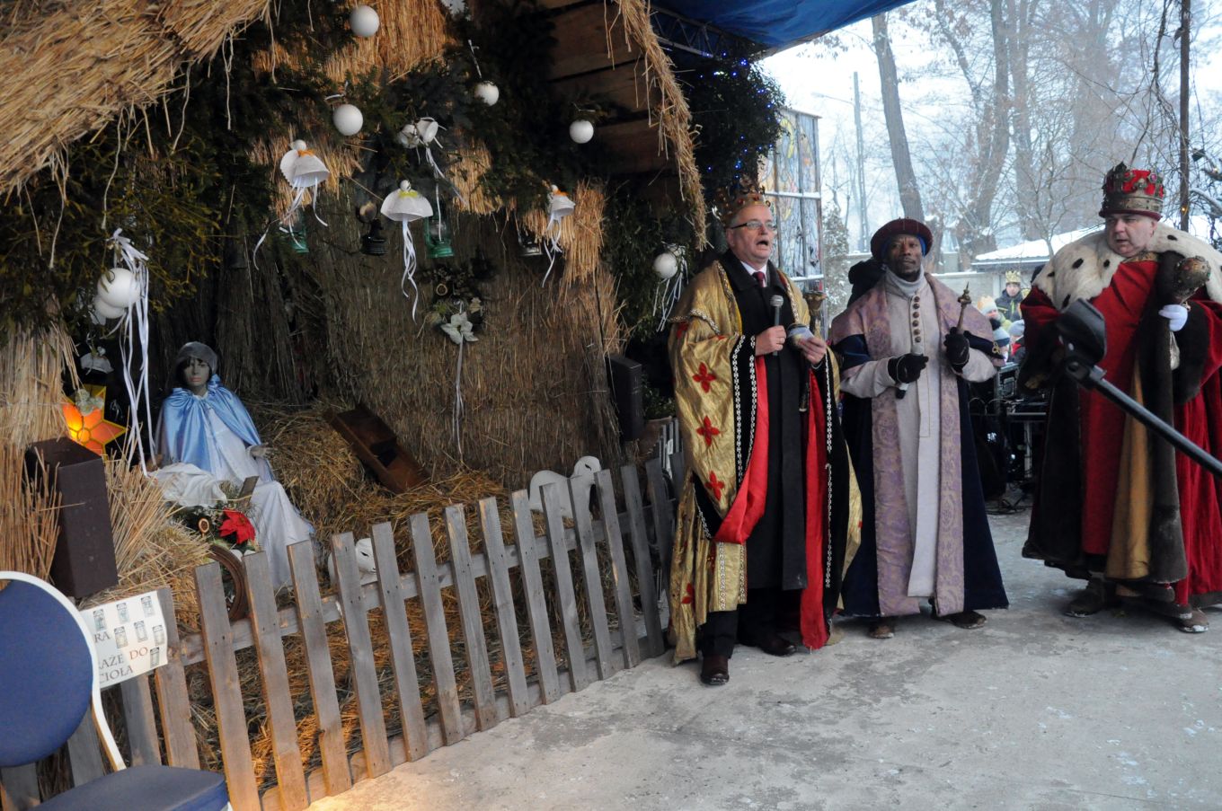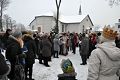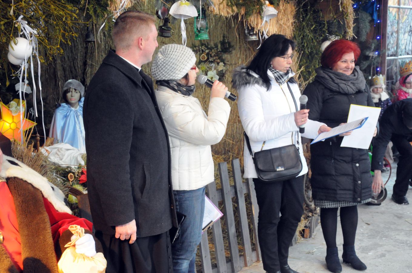 Celem uroczystych orszaków była oczywiście betlejemska stajenka przygotowana na przykościelnym placu naszego kościoła. Część naszych parafian dołączyła do orszaków wędrujących z innych parafii. Pozostali zaś oczekiwali na przybycie gości przed szopką, wypełniając czas śpiewem kolęd pod przewodnictwem młodzieżowej scholi, ks. Piotra i Pana Mirosława – naszego organisty. Przybysze z odległych stron (czytaj parafii) oddali pokłon Boskiemu Dziecięciu i złożyli swe dary. Zgromadzeni parafinie i goście mogli następnie obejrzeć scenkę przedstawiającą wizytę mędrców u króla Heroda. Wierszowane teksty z dziecięcych teatrzyków w ustach dojrzałych mężczyzn brzmiały, co prawda, dość groteskowo. Wpisały jednak się w ogólną ludową konwencję, która, podobnie jak w ubiegłym roku, towarzyszyła uroczystości. Część osób zgromadzonych przed szopką wysłuchało koncertu kolęd w wykonaniu ludowych zespołów „Skrzynkowianki” (oczywiście ze Skrzynek koło Ujazdu) i zespołu „Ustronie” ze Skierniewic. Wielu przybyłych gości udało się natomiast do wnętrza kościoła, by oddać pokłon Wcielonemu Słowu obecnemu wśród nas w Najświętszym Sakramencie, obejrzeć przygotowaną w kościele szopkę i podziwiać ciągle piękniejące wnętrze naszej świątyni.
