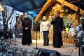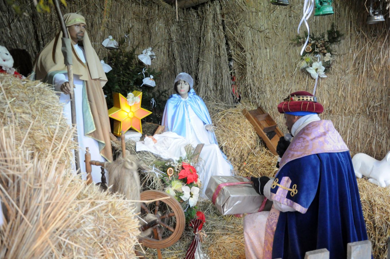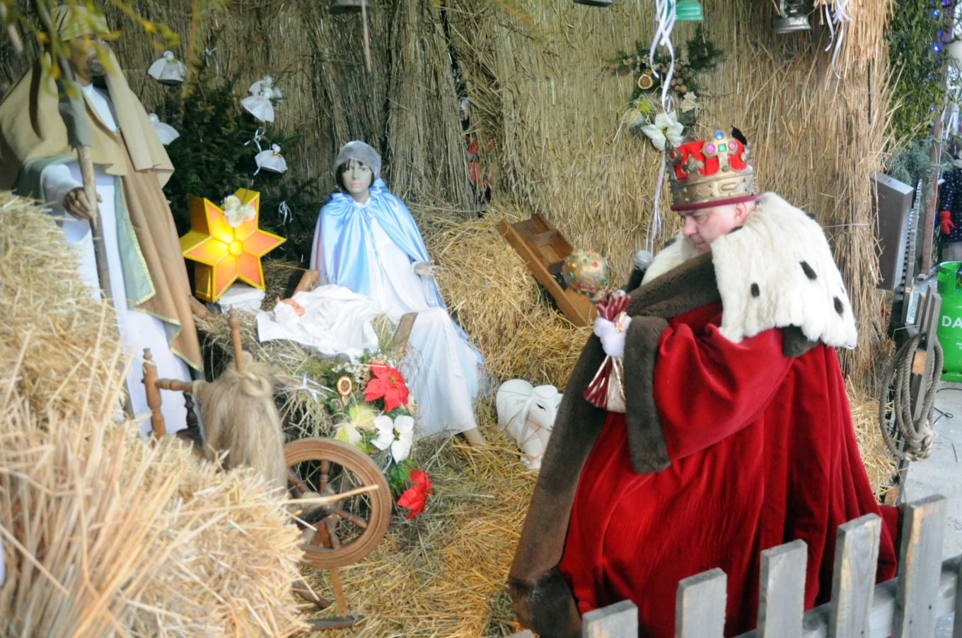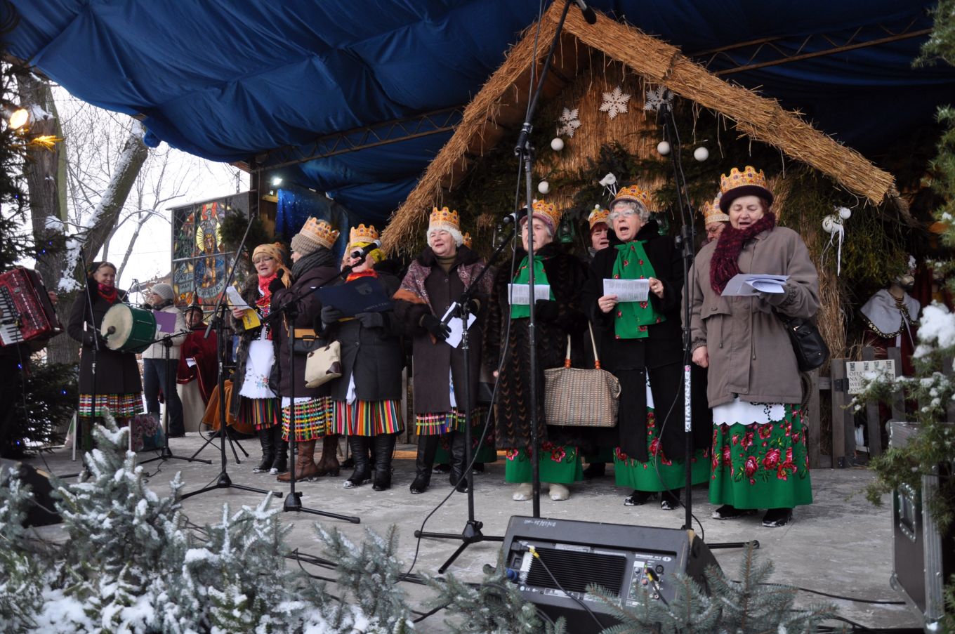 Celem uroczystych orszaków była oczywiście betlejemska stajenka przygotowana na przykościelnym placu naszego kościoła. Część naszych parafian dołączyła do orszaków wędrujących z innych parafii. Pozostali zaś oczekiwali na przybycie gości przed szopką, wypełniając czas śpiewem kolęd pod przewodnictwem młodzieżowej scholi, ks. Piotra i Pana Mirosława – naszego organisty. Przybysze z odległych stron (czytaj parafii) oddali pokłon Boskiemu Dziecięciu i złożyli swe dary. Zgromadzeni parafinie i goście mogli następnie obejrzeć scenkę przedstawiającą wizytę mędrców u króla Heroda. Wierszowane teksty z dziecięcych teatrzyków w ustach dojrzałych mężczyzn brzmiały, co prawda, dość groteskowo. Wpisały jednak się w ogólną ludową konwencję, która, podobnie jak w ubiegłym roku, towarzyszyła uroczystości. Część osób zgromadzonych przed szopką wysłuchało koncertu kolęd w wykonaniu ludowych zespołów „Skrzynkowianki” (oczywiście ze Skrzynek koło Ujazdu) i zespołu „Ustronie” ze Skierniewic. Wielu przybyłych gości udało się natomiast do wnętrza kościoła, by oddać pokłon Wcielonemu Słowu obecnemu wśród nas w Najświętszym Sakramencie, obejrzeć przygotowaną w kościele szopkę i podziwiać ciągle piękniejące wnętrze naszej świątyni.