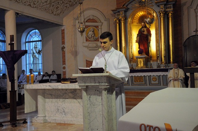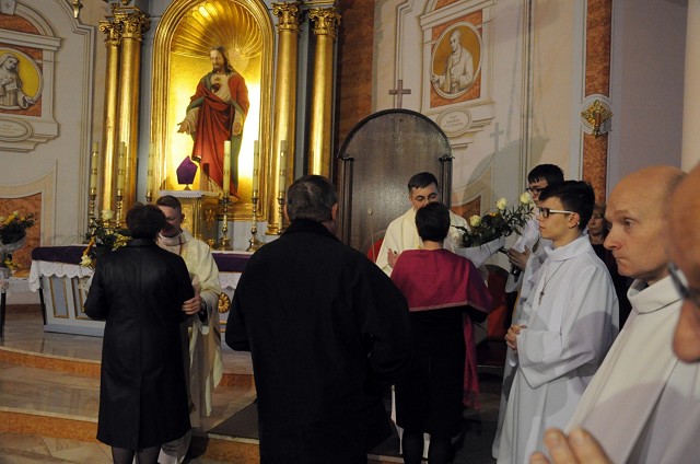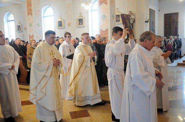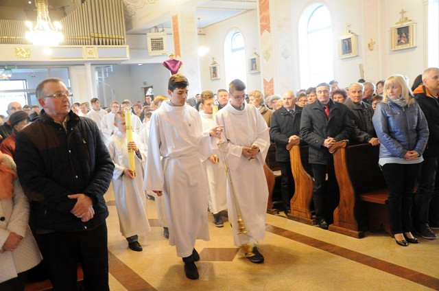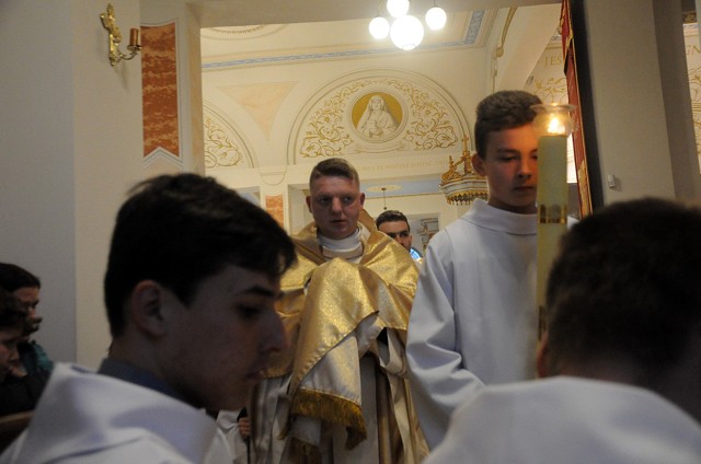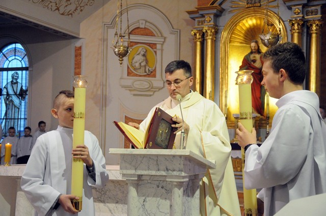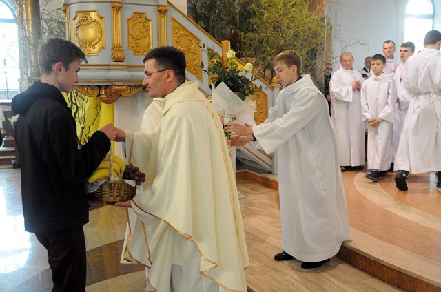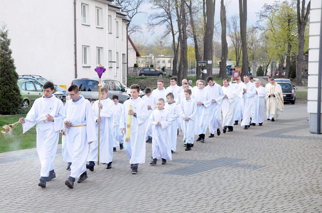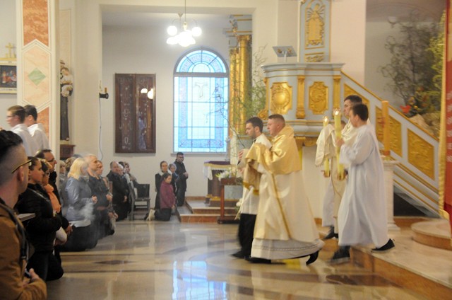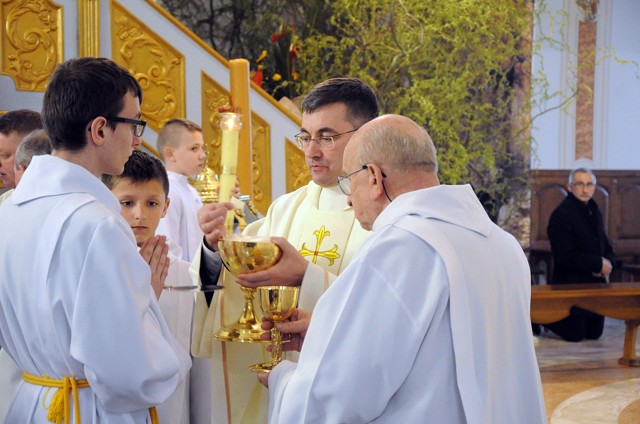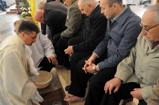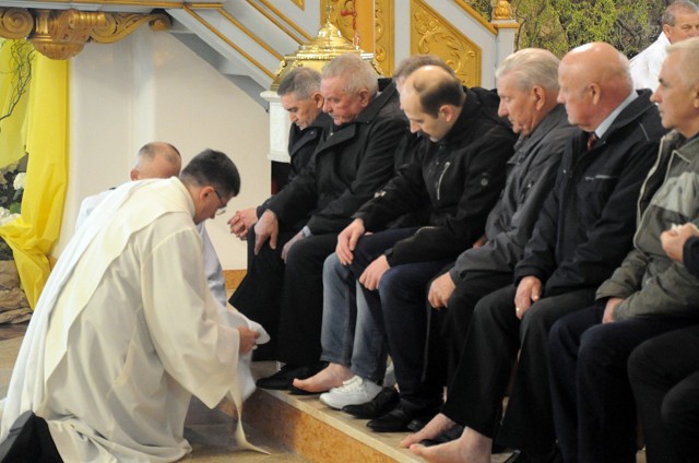 W Wielki Czwartek we wspólnotach parafialnych sprawuje się tylko jedną Eucharystię - wieczorem, tzw. Mszę Wieczerzy Pańskiej. W naszej parafii ta msza św. odprawiana jest o godz. 1800. Jedynie w kościołach katedralnych przez południem odprawiana jest Msza Krzyżma Świętego, na której gromadzą się kapłani danej diecezji, by pod przewodnictwem swojego biskupa odnowić święcenia kapłańskie i poświęcić święte oleje używane podczas sakramentów w ciągu całego roku. Wraz z modlitwą popołudniową kończy się okres Wielkiego Postu. Mszą Wieczerzy Pańskiej, Kościół rozpoczyna Triduum Paschalne. Wspomina ona tę ostatnią wieczerzę, w czasie której Pan Jezus tej nocy, której był wydany, umiłowawszy aż do końca swoich, którzy byli na świecie, ofiarował Bogu Ojcu swoje Ciało i Krew pod postaciami chleba i wina, i dał Apostołom, aby spożywali, polecił również im oraz ich następcom w kapłaństwie składać ofiarę. Cała uwaga duszy powinna się zwrócić na misteria, które wspomina się w czasie tej mszy: mianowicie ustanowienie Eucharystii i kapłaństwa oraz polecenie Pana o miłości bratniej. Najważniejszym znakiem Wielkiego Czwartku jest stół. Po prostu - stół. Nakrywa się go białym obrusem, kiedy sprawuje się na nim Wieczerzę Pańską i zdejmuje się ten obrus zaraz po tym wydarzeniu, bowiem w Wielki Piątek Eucharystia nie będzie celebrowana. Stół tego dnia ma być bardzo wyraźnym znakiem. Jak rodzina w domu staje się nią bardziej, gdy wszyscy jej członkowie zasiadają do stołu, tak i parafia jest rodziną przez to, że ma swój stół. Przed mszą wieczorną tabernakulum powinno być zupełnie puste. W czasie śpiewania hymnu "Chwała na wysokości" biją dzwony, które po skończeniu hymnu milkną aż do hymnu "Chwała na wysokości" Wigilii Paschalnej. Umywanie nóg wybranym mężczyznom, które zgodnie z tradycją odbywa się w tym dniu, oznacza postawę służebną i miłość Chrystusa, który nie przyszedł aby mu służono, lecz aby służyć. W tym dniu ustanowienia sakramentu kapłaństwa dziękujemy też naszym kapłanom za ich posługę.