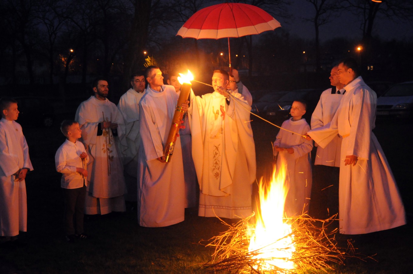 Pierwszym znakiem liturgii Wigilii Paschalnej jest ciemność. Ciemność jest symbolem śmierci. Pod osłoną nocy uaktywniają się siły zła, dokonuje się najwięcej grabieży, napadów, rozbojów, cudzołóstwa. W ciemności kolory tracą swoją wyrazistość, zacierają się kształty, zamiera życie. Ciemność musi być tłem dla liturgii paschalnej. Gdybyśmy w dzień rozpalili ognisko, światło z niego bijące byłoby mało czytelne. Ale gdy jest prawdziwa ciemność, to w pewnym momencie słup ognia ją rozdziera. Właśnie eksplozja światła jest drugim znakiem liturgii Wielkiej Nocy. Ogień jest symbolem samego Chrystusa, tak jak ciemność jest symbolem złego. Z taką symboliką spotykamy się w Biblii: począwszy od płonącego krzewu na pustyni, przez który objawił się Bóg Mojżeszowi, słup ognia, który prowadził Izraelitów, przez to światło, które rozpromieniało modlącego się Mojżesza, aż do światła w Wielką Noc. Nie ma świadków momentu zmartwychwstania, ale są świadkowie eksplozji światła z grobu. Światło pojawia się zawsze przy biblijnych teofaniach, objawieniach się Boga. Ogień i błyskawice mówią o obecności Boga. Właśnie w tę Noc Bóg zrywa kajdany zła, kajdany śmierci.