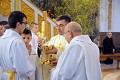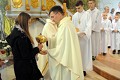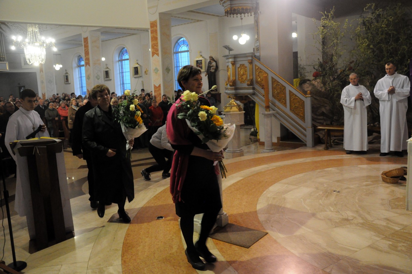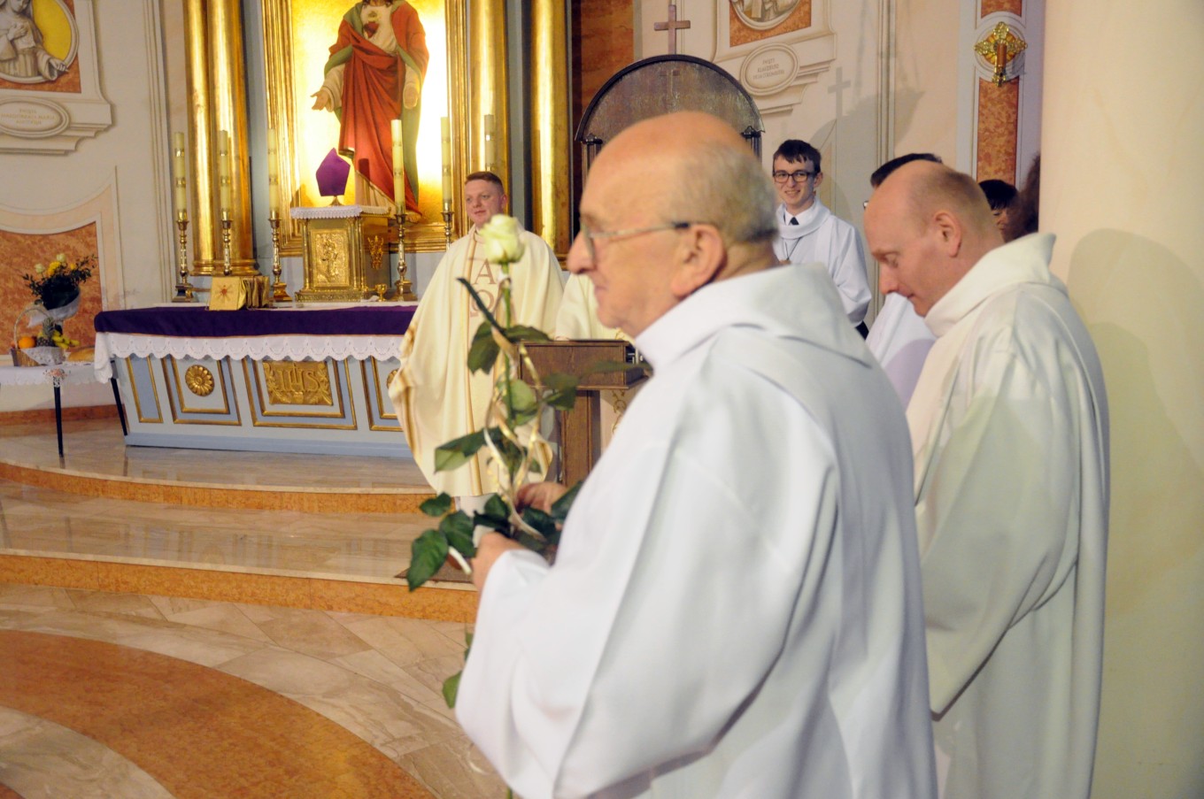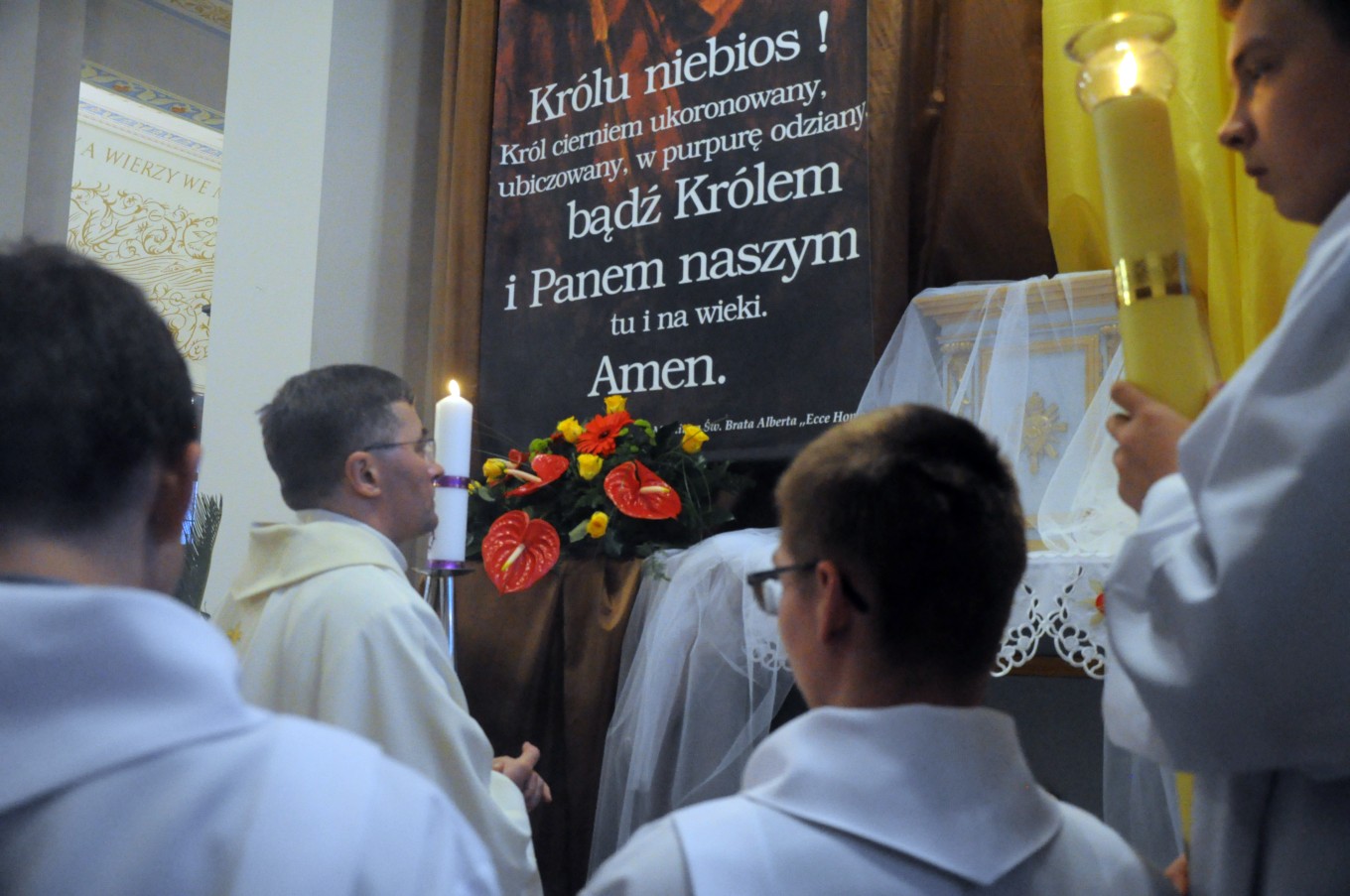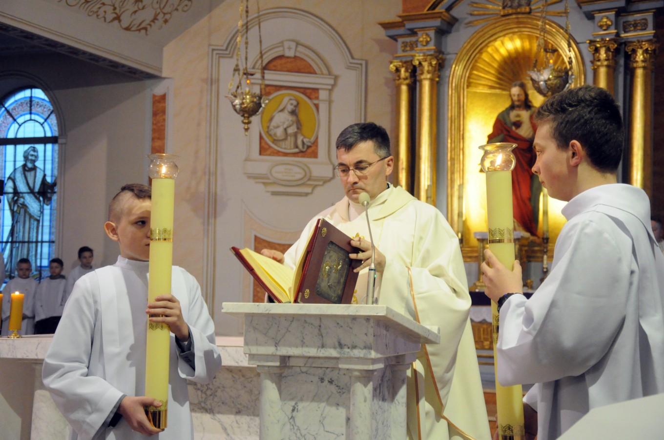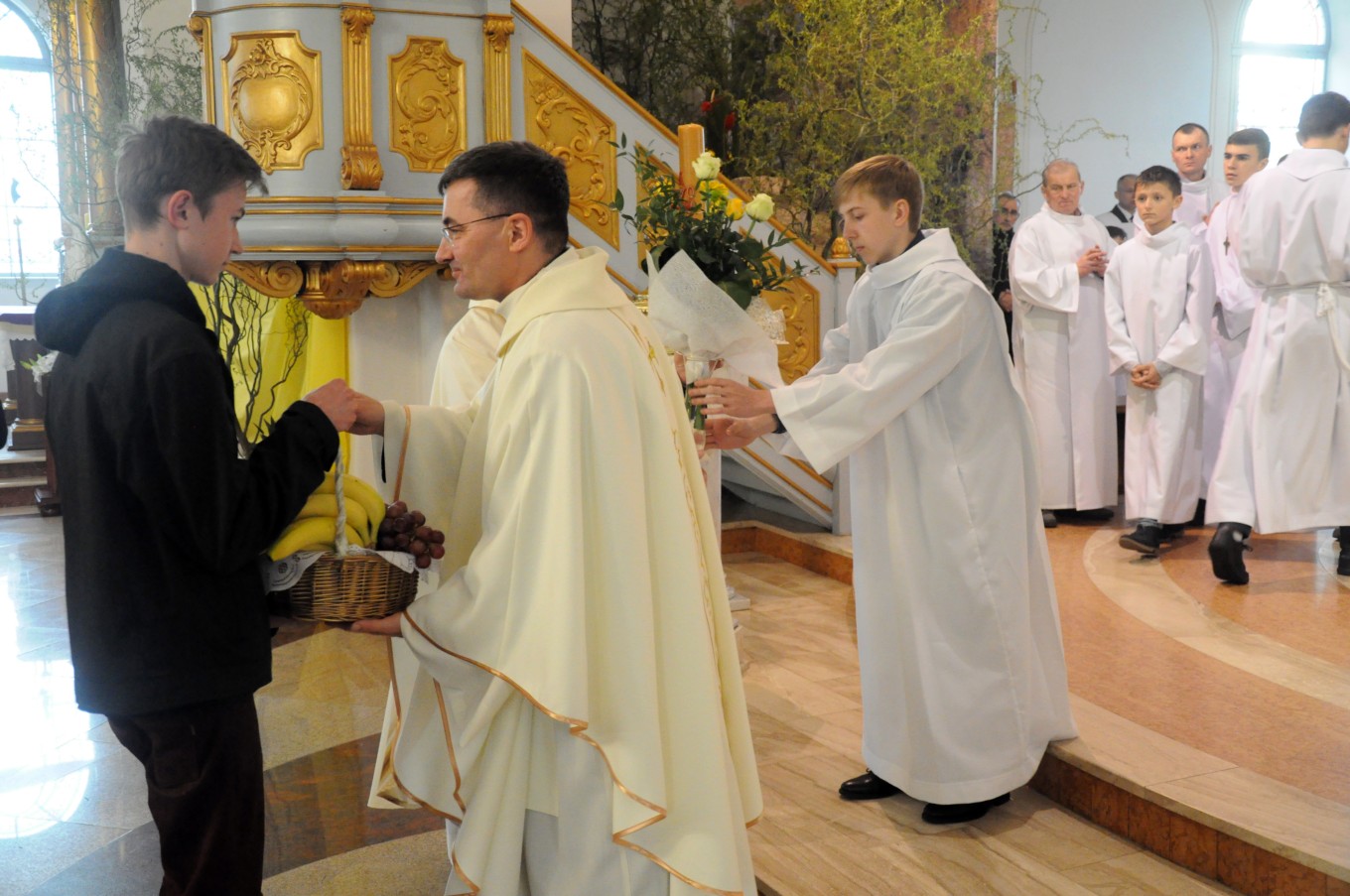 W Wielki Czwartek we wspólnotach parafialnych sprawuje się tylko jedną Eucharystię - wieczorem, tzw. Mszę Wieczerzy Pańskiej. W naszej parafii ta msza św. odprawiana jest o godz. 1800. Jedynie w kościołach katedralnych przez południem odprawiana jest Msza Krzyżma Świętego, na której gromadzą się kapłani danej diecezji, by pod przewodnictwem swojego biskupa odnowić święcenia kapłańskie i poświęcić święte oleje używane podczas sakramentów w ciągu całego roku. Wraz z modlitwą popołudniową kończy się okres Wielkiego Postu. Mszą Wieczerzy Pańskiej, Kościół rozpoczyna Triduum Paschalne. Wspomina ona tę ostatnią wieczerzę, w czasie której Pan Jezus tej nocy, której był wydany, umiłowawszy aż do końca swoich, którzy byli na świecie, ofiarował Bogu Ojcu swoje Ciało i Krew pod postaciami chleba i wina, i dał Apostołom, aby spożywali, polecił również im oraz ich następcom w kapłaństwie składać ofiarę. Cała uwaga duszy powinna się zwrócić na misteria, które wspomina się w czasie tej mszy: mianowicie ustanowienie Eucharystii i kapłaństwa oraz polecenie Pana o miłości bratniej. Najważniejszym znakiem Wielkiego Czwartku jest stół. Po prostu - stół. Nakrywa się go białym obrusem, kiedy sprawuje się na nim Wieczerzę Pańską i zdejmuje się ten obrus zaraz po tym wydarzeniu, bowiem w Wielki Piątek Eucharystia nie będzie celebrowana. Stół tego dnia ma być bardzo wyraźnym znakiem. Jak rodzina w domu staje się nią bardziej, gdy wszyscy jej członkowie zasiadają do stołu, tak i parafia jest rodziną przez to, że ma swój stół. Przed mszą wieczorną tabernakulum powinno być zupełnie puste. W czasie śpiewania hymnu „Chwała na wysokości” biją dzwony, które po skończeniu hymnu milkną aż do hymnu „Chwała na wysokości” Wigilii Paschalnej. Umywanie nóg wybranym mężczyznom, które zgodnie z tradycją odbywa się w tym dniu, oznacza postawę służebną i miłość Chrystusa, który nie przyszedł aby mu służono, lecz aby służyć. W tym dniu ustanowienia sakramentu kapłaństwa dziękujemy też naszym kapłanom za ich posługę.