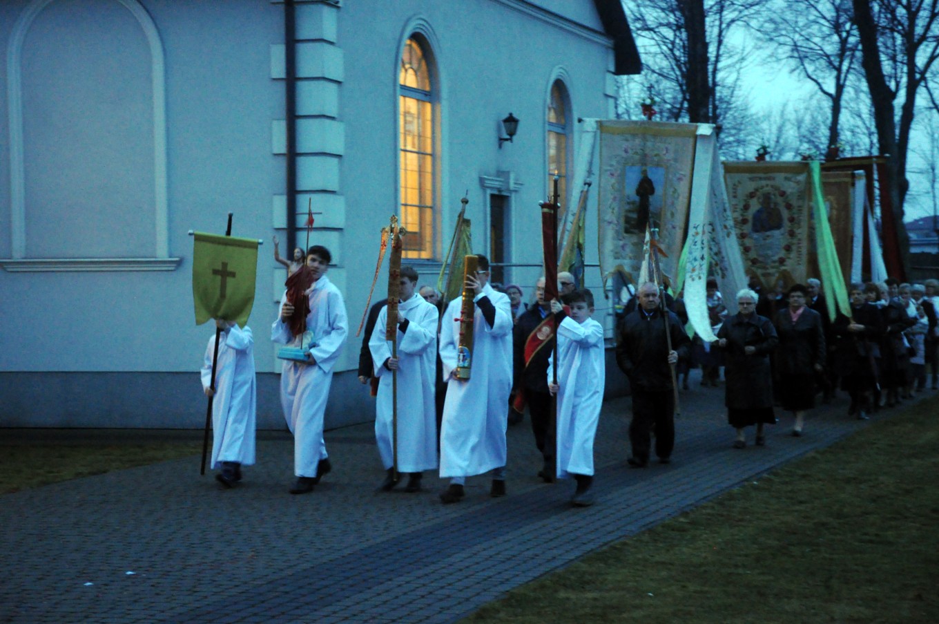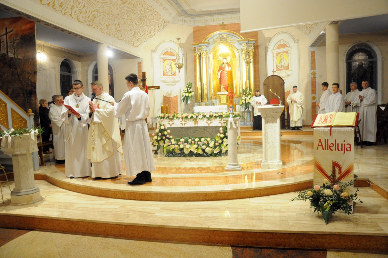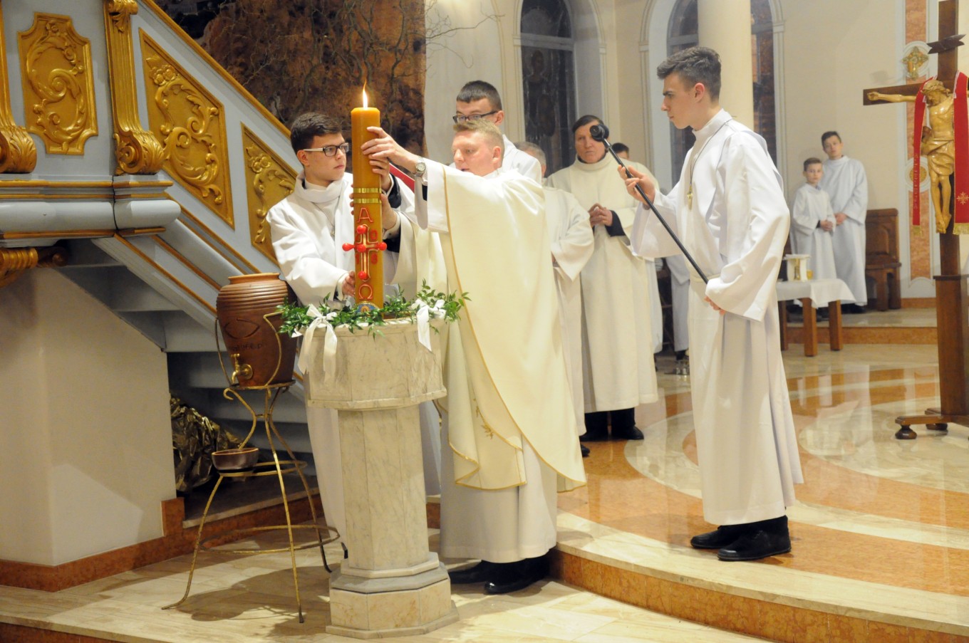 W sobotni wieczór, po zachodzie słońca, rozpoczyna się Wielka Noc. O godzinie 20 uczestniczymy w Liturgii Wigilii Paschalnej. Składa się ona z 4 części: Liturgii Światła (podczas której następuje poświęcenie ognia), Liturgii Słowa (ukazującą całą historię Zbawienia), Liturgii Chrzcielnej (podczas której zostają odnowione przyrzeczenia chrzcielne) i Liturgii Eucharystycznej (podczas której przyjmujemy Komunię Świętą - pokarm na życie wieczne). Obchody Wielkiej Nocy kończymy rano w Niedzielę Zmartwychwstania Pańskiego uczestnicząc w procesji rezurekcyjnej i ogłaszając całemu światu, że Chrystus prawdziwie zmartwychwstał.