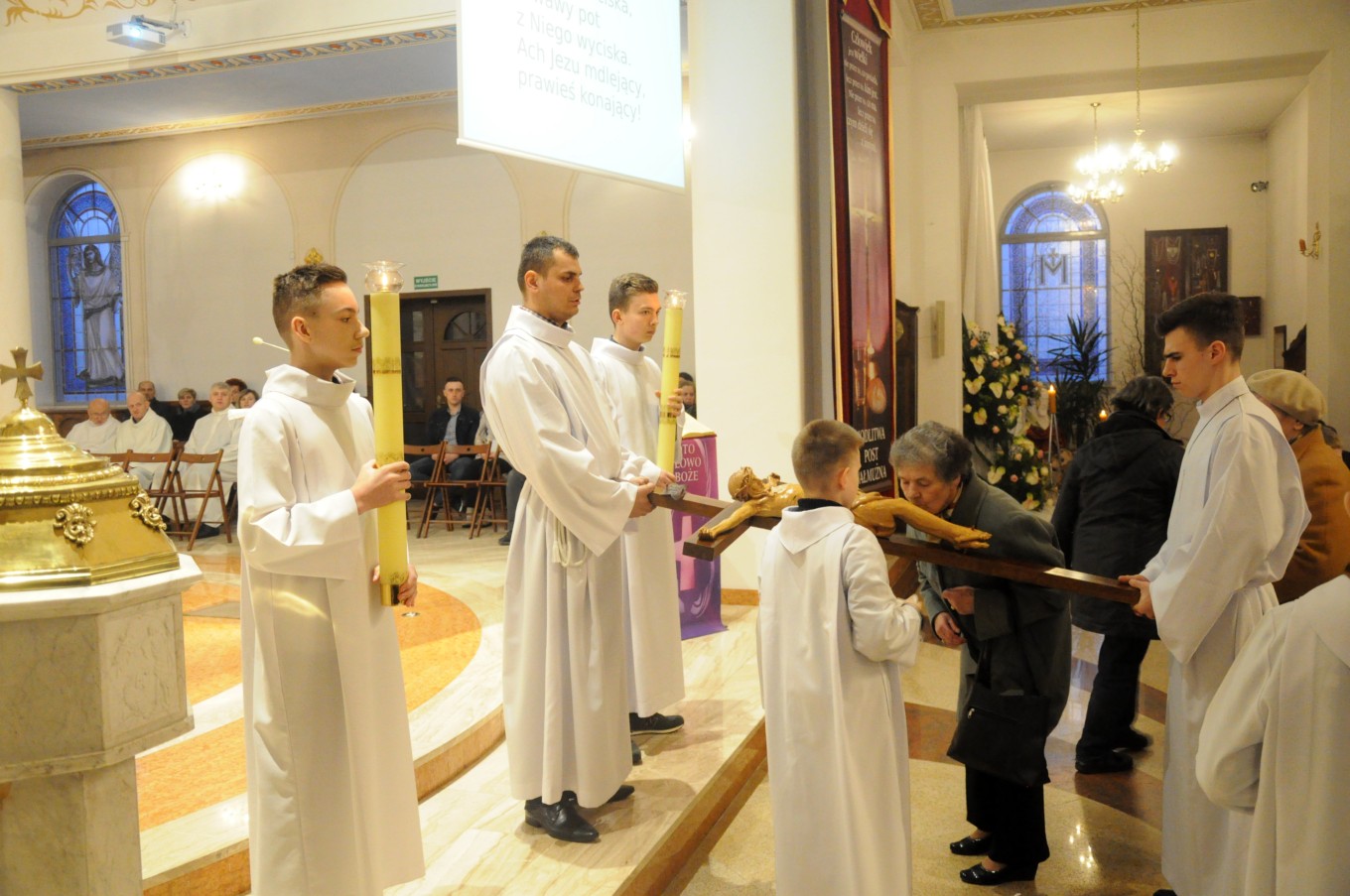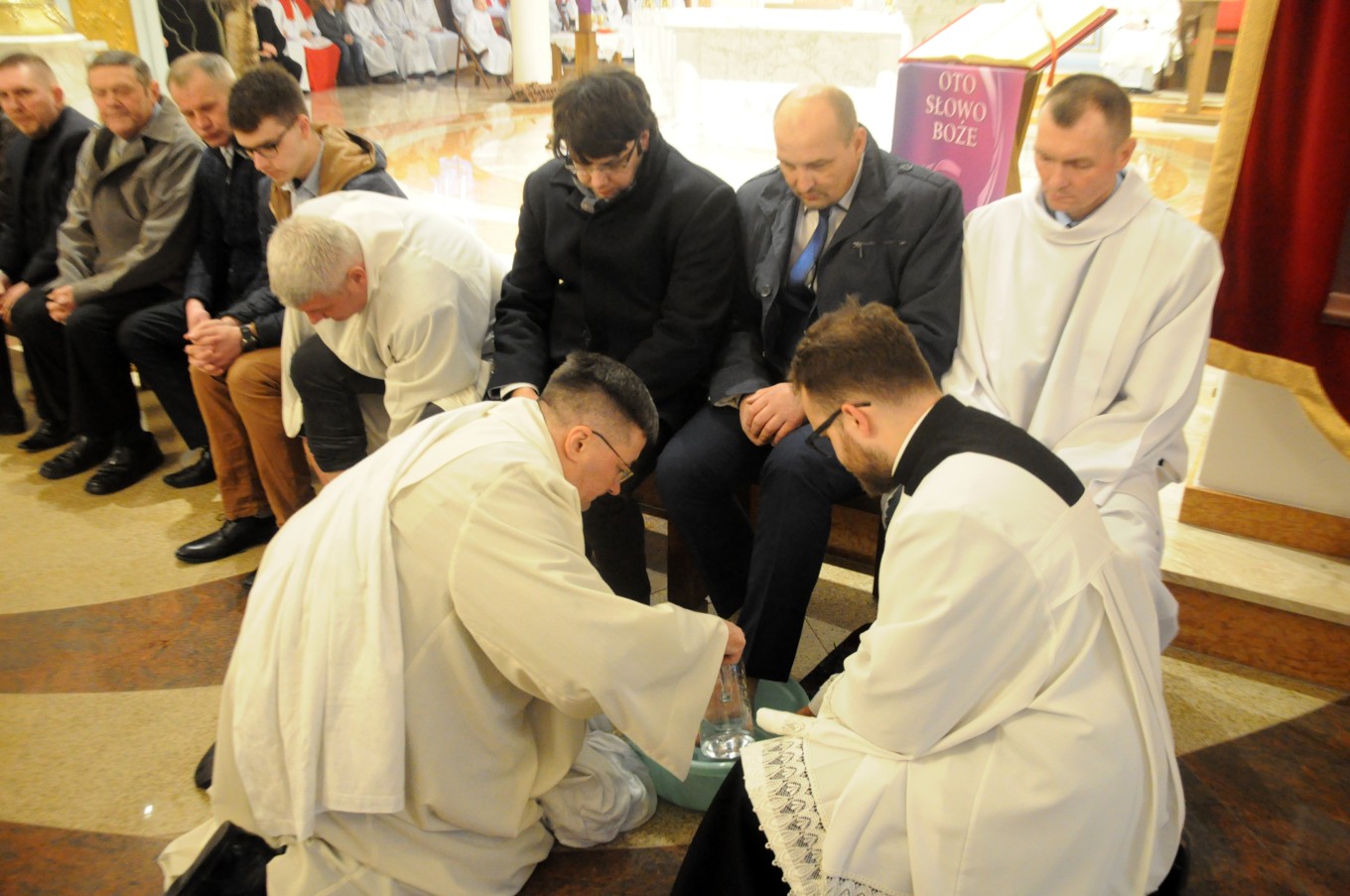 W Wielki Czwartek wspominamy wydarzenia z Ostatniej Wieczerzy. Pan Jezus ustanowił wtedy sakrament Eucharystii i Kapłaństwa. W czasie Mszy Wieczerzy Pańskiej, na pamiątkę obmycia nóg Apostołom przez Chrystusa, główny celebrans obmywa nogi 12 mężczyznom, aby podkreślić służebny charakter kapłaństwa. W tym roku w naszej parafii do tego znaku zostali zaproszeni przedstawiciele Rady Parafialnej. Tego dnia w naszym kościele wierni przyjmują komunię świętą pod dwoma postaciami. Msza Wieczerzy Pańskiej kończy przeniesieniem Najświętszego Sakramentu do kaplicy przechowania i rozpoczyna się Wielki Piątek.