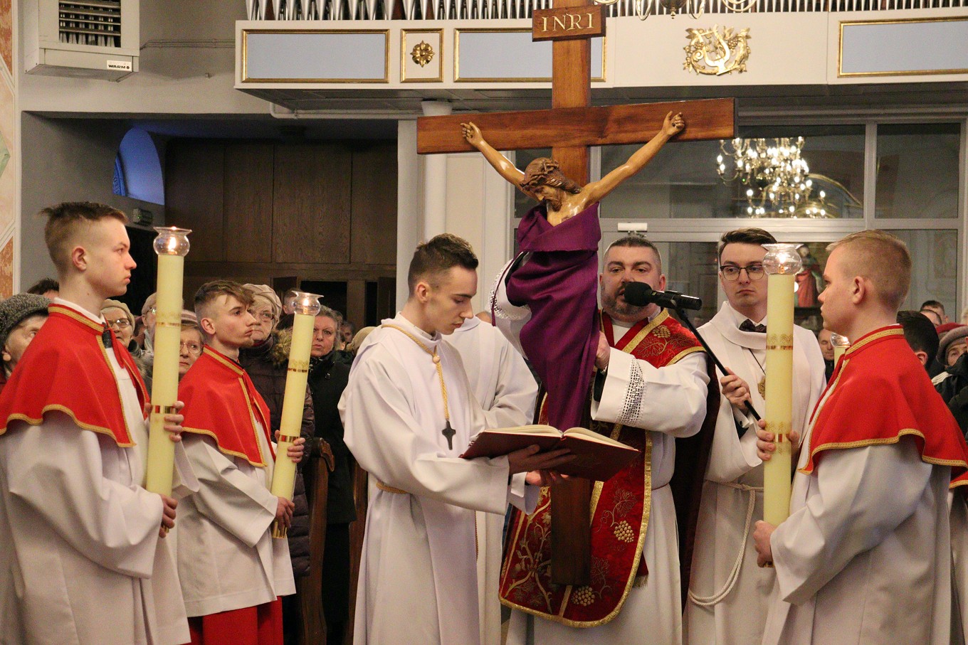 W Wielki Czwartek wspominamy wydarzenia z Ostatniej Wieczerzy. Pan Jezus ustanowił wtedy sakrament Eucharystii i Kapłaństwa. W czasie Mszy Wieczerzy Pańskiej, na pamiątkę obmycia nóg Apostołom przez Chrystusa, główny celebrans obmywa nogi 12 mężczyznom, aby podkreślić służebny charakter kapłaństwa. W tym roku w naszej parafii do tego znaku zostali zaproszeni przedstawiciele Rady Parafialnej. Tego dnia w naszym kościele wierni przyjmują komunię świętą pod dwoma postaciami. Msza Wieczerzy Pańskiej kończy przeniesieniem Najświętszego Sakramentu do kaplicy przechowania i rozpoczyna się Wielki Piątek.