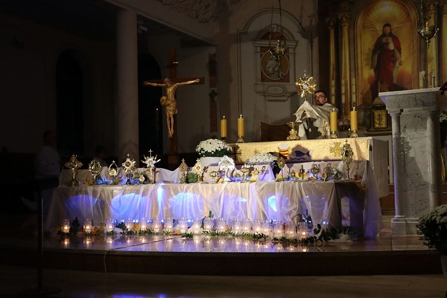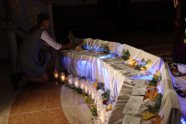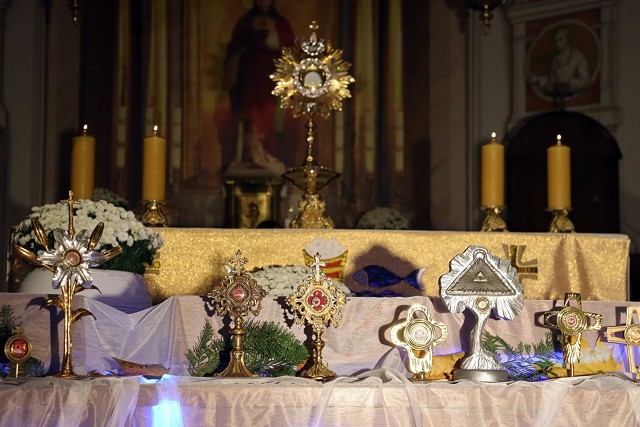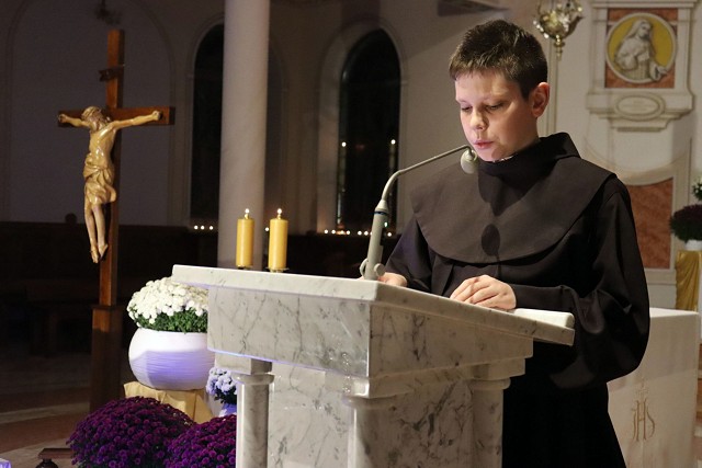 Po uroczystej Eucharystii, podczas której kazanie nt. świętości wygłosił ks. wikariusz Krystian Lota, najmłodsi parafianie przedstawili wszystkim licznie zebranym żywoty 18 świętych i błogosławionych, wnosząc zarazem ich relikwie, a wszystko to okraszone pięknym śpiewem oraz grą na skrzypcach! Najważniejszym momentem w/w uroczystości stało się Wystawienie Najświętszego Sakramentu, uroczyście odśpiewano Litanię do Wszystkich Świętych, modlono się dziesiatką Różańca św. konferencję z osobistym świadectwem wygłosił ks. proboszcz Paweł Dziedziczak, wszyscy zebrani ucałowali relikwie, przy okazji losując świętego, który w szczególny sposób będzie nam patronował przez najbliższy czas, a także częstując się "Bożą Krówką" z cytatem z Pisma św.