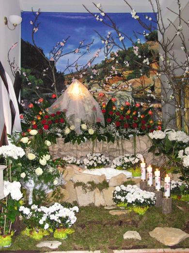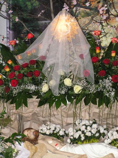 udekorowany na kształt grobu Chrystusa.. Monstrancja okryta jest