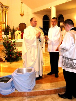 niech przez Syna Twojego zstąpi na tę wodę moc Ducha Świętego".