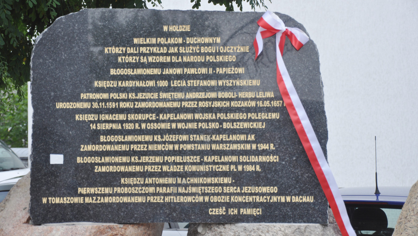 - Księdzu Antoniemu Machnikowskiemu pierwszemu proboszczowi parafii NSJ w Tomaszowie Maz. zamordowanemu przez Hitlerowców w niemieckim obozie koncentracyjnym w Dachau