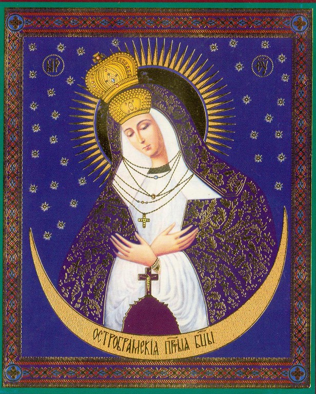 Również na ikonach prawosławnych inspirowanych obrazem ostrobramskim występują zarówno promienie i gwiazdy wokół głowy Maryi, jak też półksiężyc zamykający kompozycję od dołu (Foto 7i).