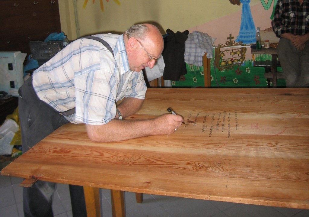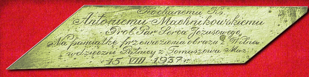 Z napisu wynika, że wraz z dużym obrazem, jako dar dla ówczesnego Proboszcza ks. Antoniego Machnikowskiego został przywieziony odnaleziony ryngraf.