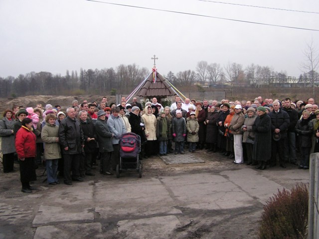 Wkrótce po przywiezieniu, poświęcony w Wilnie obraz został umieszczony na swoim docelowym miejscu. W niedzielę, 11 listopada o godzinie 14 została odprawiona przy ulicy Piaskowej Msza św., którą celebrował Ksiądz Proboszcz. Eucharystię poprzedziło poświęcenie nowo wybudowanej kapliczki. Choć była to pora obiadowa, a pogoda nie rozpieszczała, wydarzenie to zgromadziło wielu parafian, szczególnie z okolic ulicy Piaskowej. Dopisali też panowie z koła różańcowego, a wśród nich wszyscy, którzy pielgrzymowali do Wilna. W tym miejscu należy podkreślić, iż kapliczka została wybudowana staraniem firmy „Polytec-Interior Polska Sp. z o.o” w zamian za zgodę na usunięcie krzyża przydrożnego, który stał w miejscu kolidującym z budowanym parkingiem. Kapliczka została wybudowana na terenie tej firmy i całkowicie z jej środków. Od tej pory Msza św. przy kapliczce odprawiana jest każdego roku w niedzielę przed uroczystością odpustową przypadającą 16 listopada. Więcej o tych uroczystościach można przeczytać w archiwum wydarzeń.