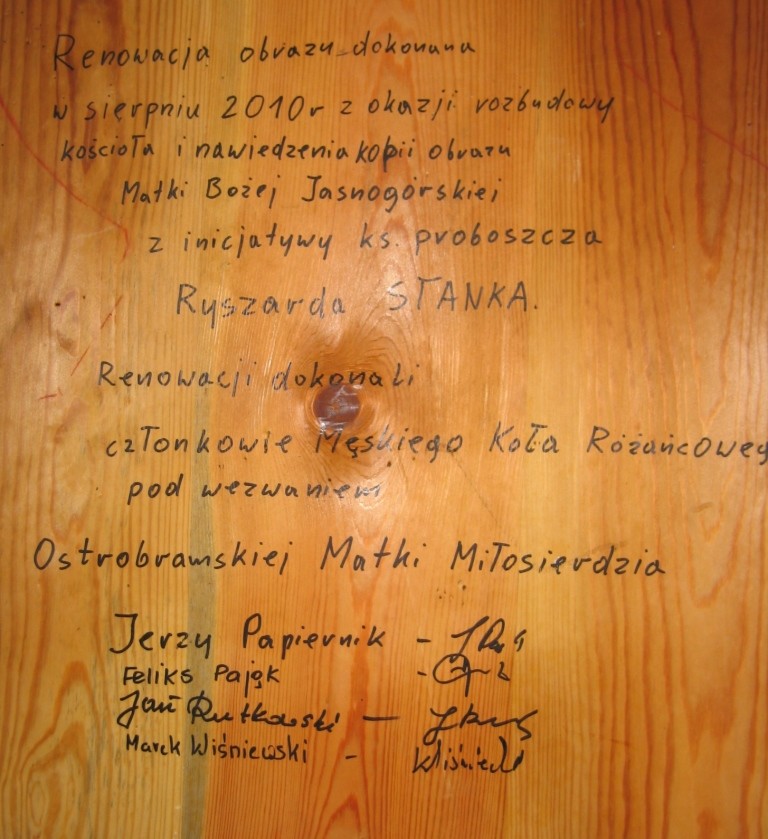 Przed ponownym montażem obrazu dokonano na podobraziu wpis upamiętniający jego renowację.